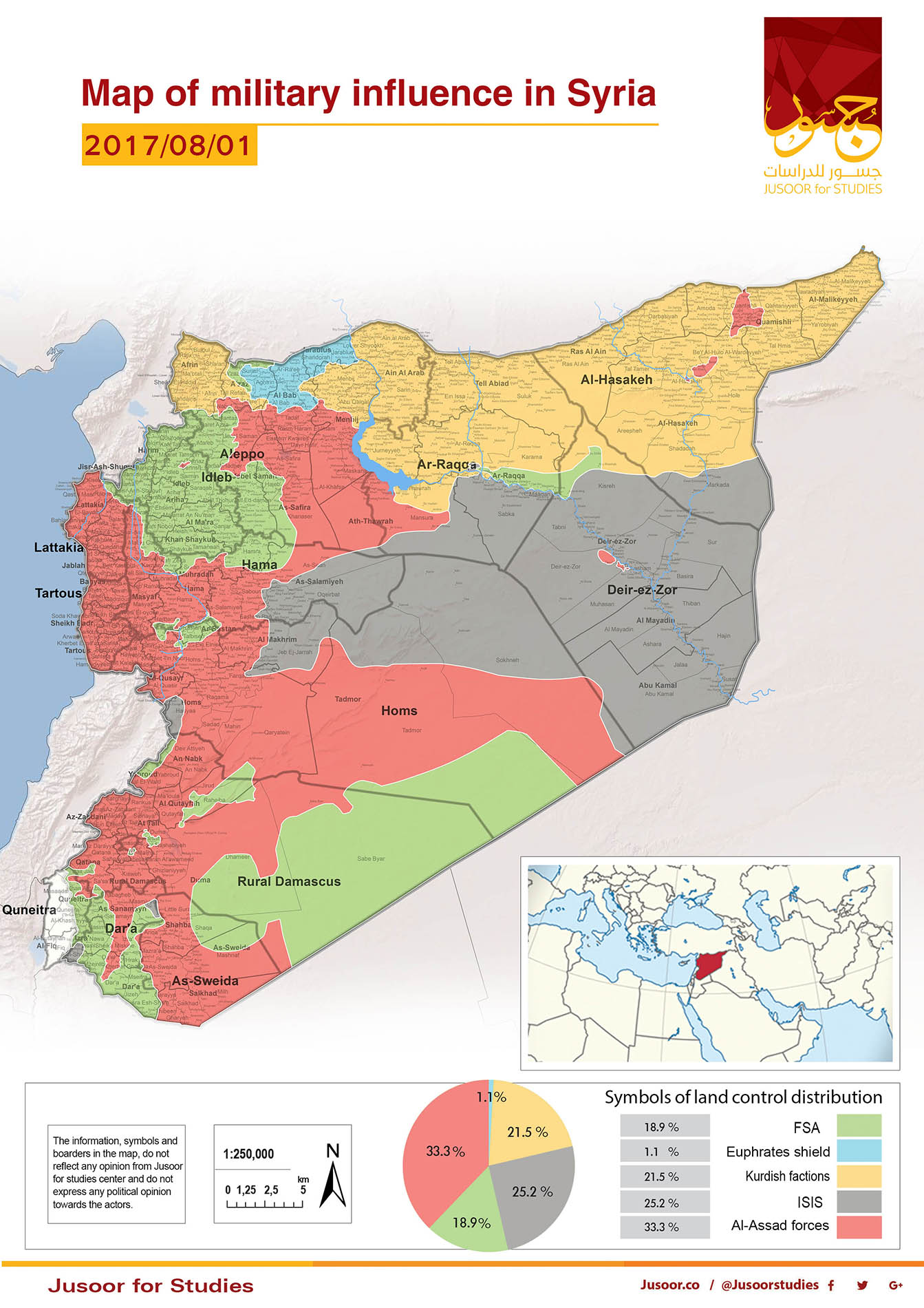 Jusoor for Studies center issued map of military influence for July 2017, which shows a slight change in the control percentage for different parties.