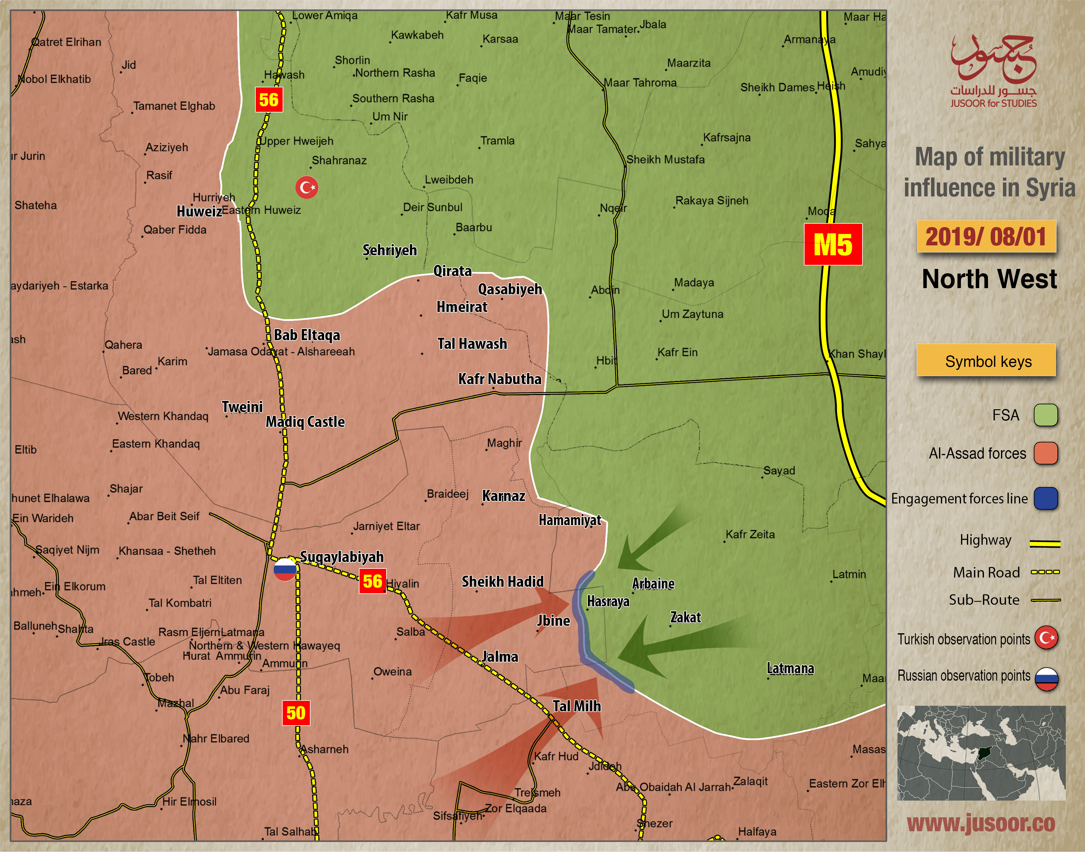 On June 28, 2019, the Syrian regime launched a ground offensive in which it regained control of the strategic al-Jabain village and hill, two sites that it had lost to the armed opposition factions on June 6, 2019. At that time, the opposition factions had also managed to gain control of the villages of Hasraya and Kfarhopd and part of al-Jalamah before withdrawing from the last two after suffering heavy bombardment. On July 29, the regime forces resumed their advance and took control of Hasmina Valley. On July 30, it also took control of the Abu Reida Western Farms area.