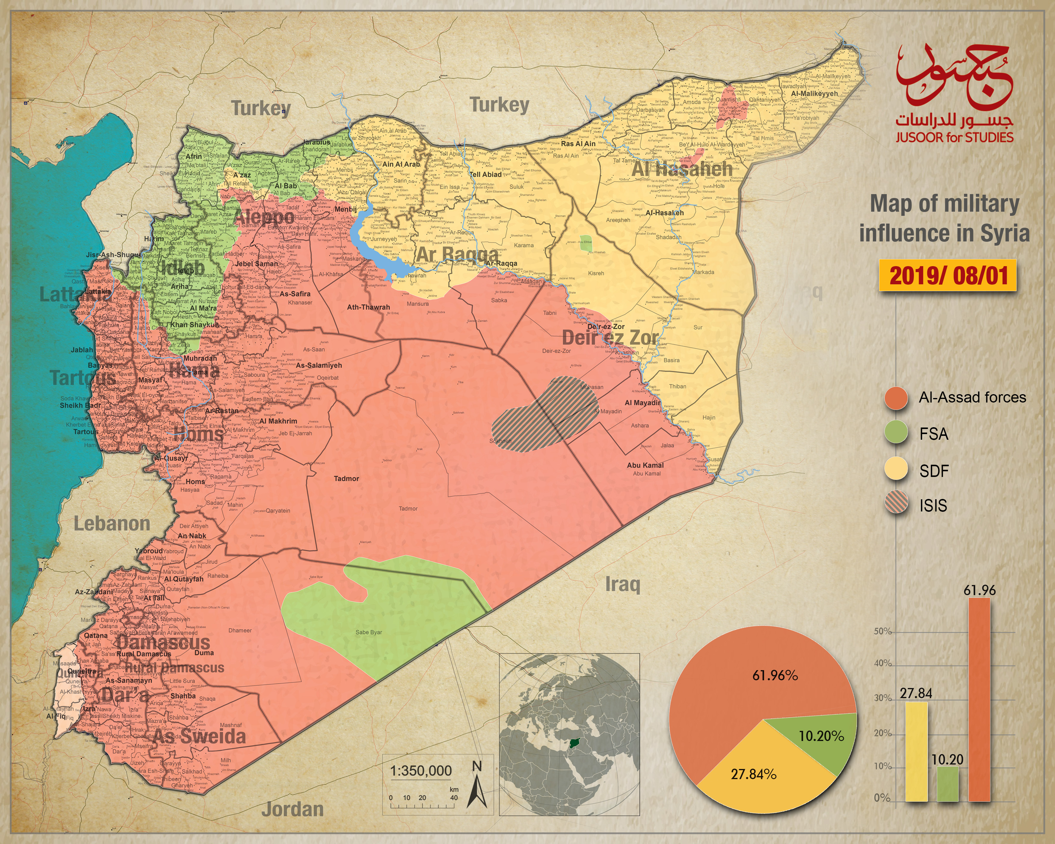 According Jusoor Center for Studies’ monthly map, the land under Syrian regime control has reached (61.96%) compared with the (61.92%) recorded in June. While the percentage of land under opposition faction control fell to (10.20%) compared with the 10.24% recorded last month.