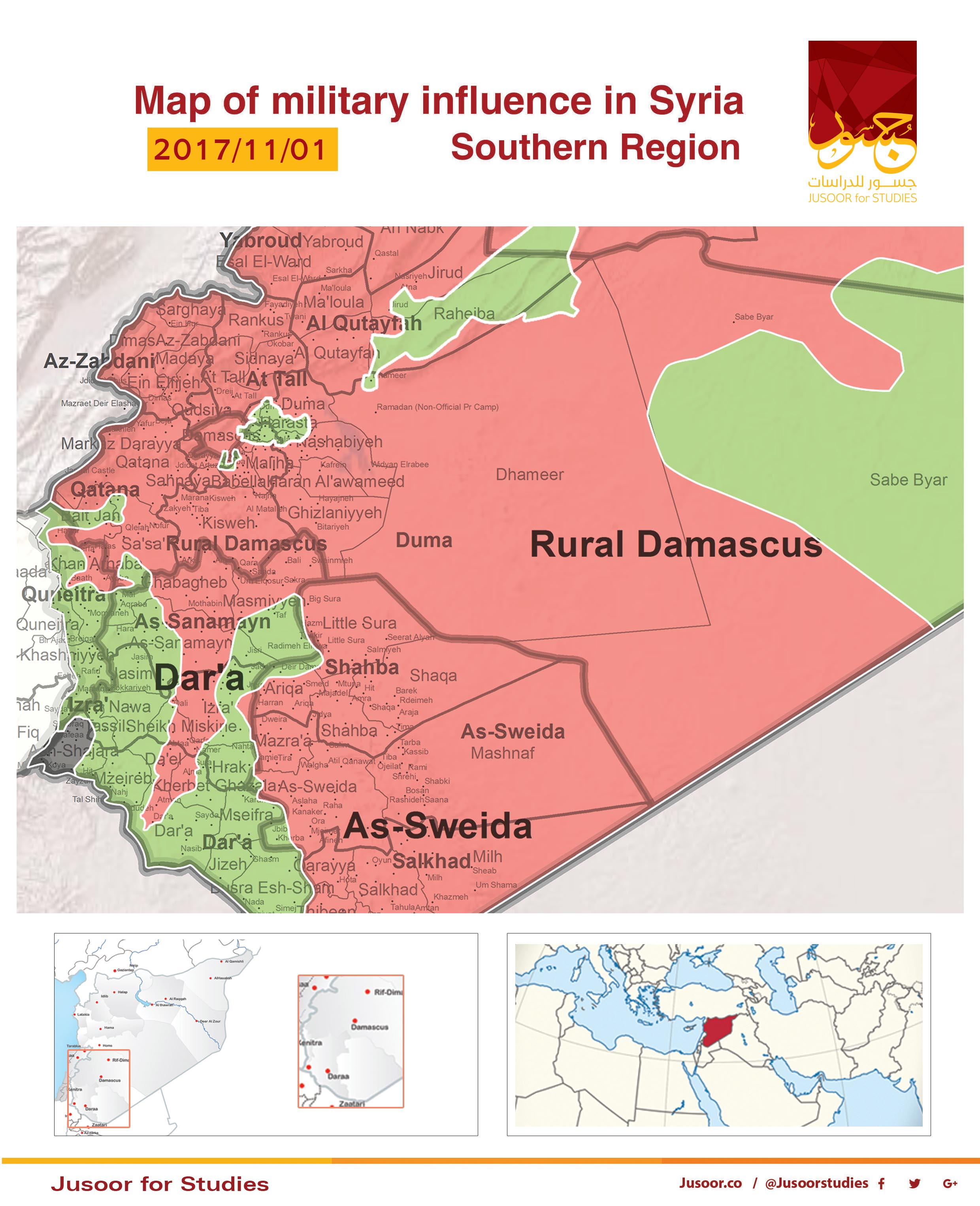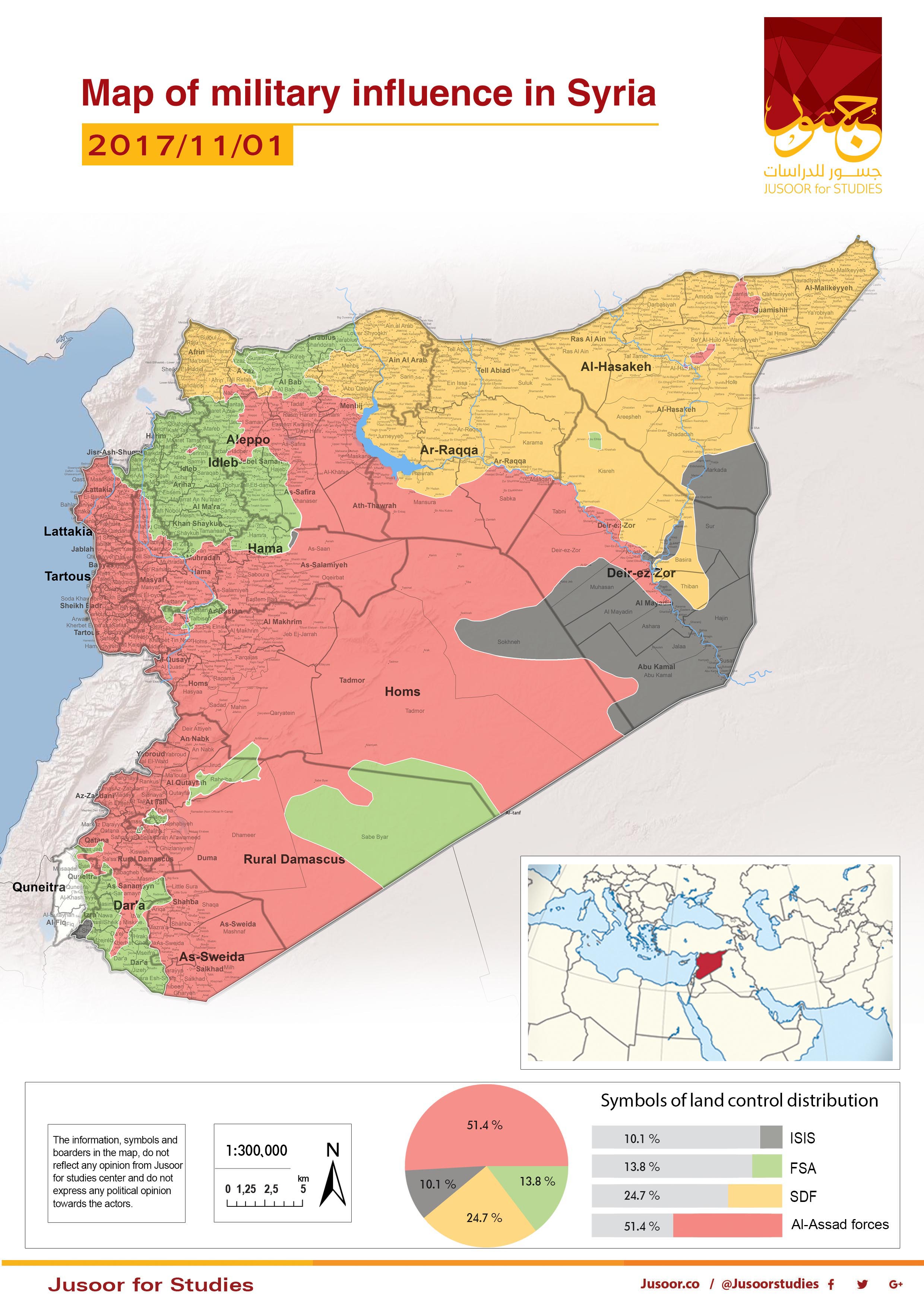 Jusoor for Studies Center issued the map of military influence in Syria for the second half of October 2017, as it shows a constant change in the total military influence percentage between the different forces. There is a notable increase in the total influence of Assad forces and Syria Democratic Forces (SDF) on the account of ISIS and the Free Syrian Army (FSA) and the new percentages are as follows: