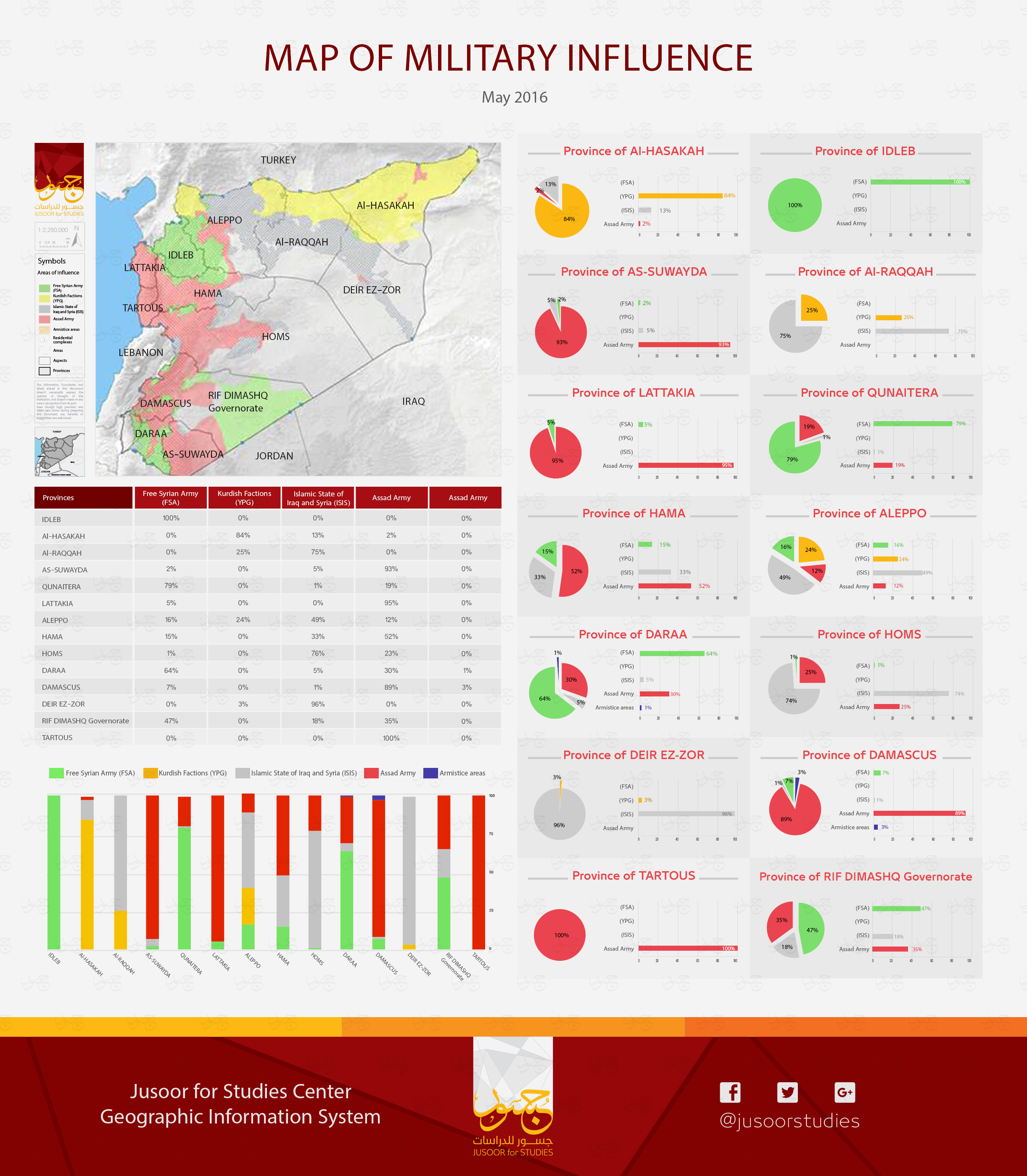 The GIS unit in JUSOOR for STUDIES Center release a Map of Military Influence in SYRIA monthly, in which the ratio of Military Force existing over the SYRIAN territories is specified, these military forces are: Free Syrian Army (FSA), Assad Army, Islamic State of Iraq and Syria (ISIS) and Kurdish Factions (YPG). The MAP specifies the presence of the former forces over the total area of Syrian territories (Influence rate over total area) and also the area of influence over the effective areas (Influence rate over effective area); which is defined by the distribution of communities (City, Town, village( and additionally important locations as airports, seaports and Important border crossings. The Center aims by releasing this map monthly to follow up the military advances in Syria by studying the actual situation of the forces and its factions in the Syrian territories, and present this advances that happen to help the local influencers know what really happens in the field so they can develop an overall perspective. The map is published in two sections, the first represent the influence area over Syria in general, while the second goes specifically to every province.