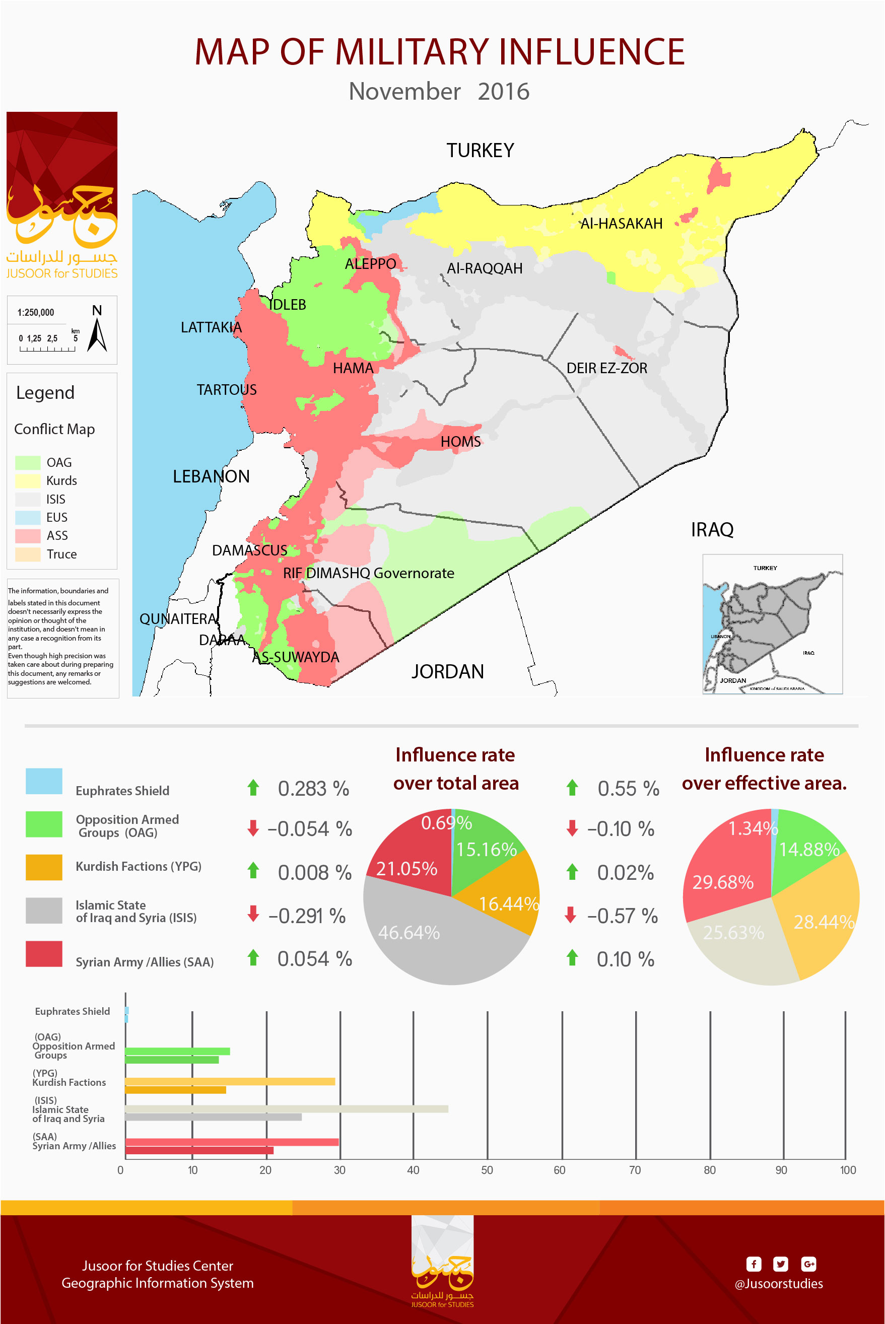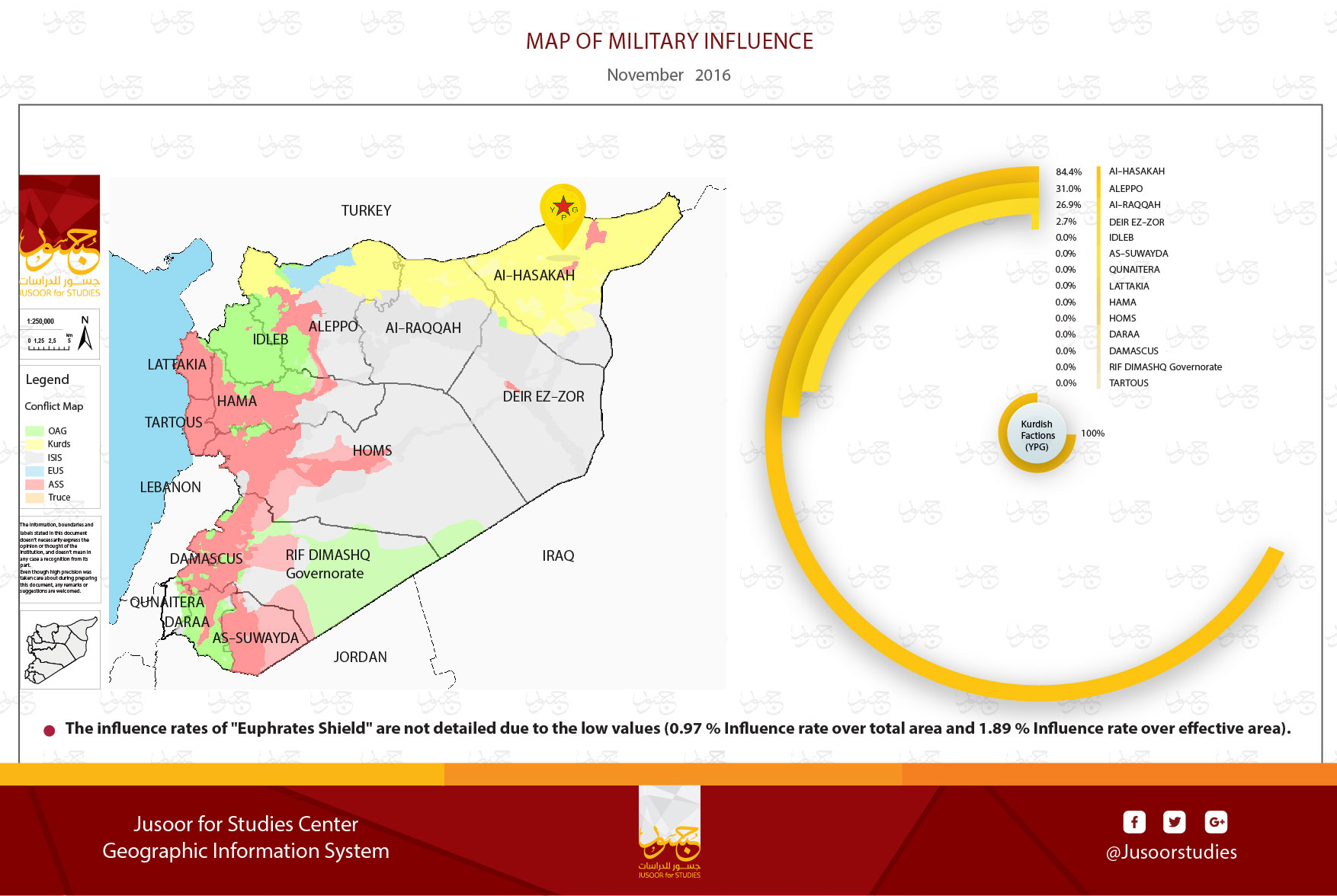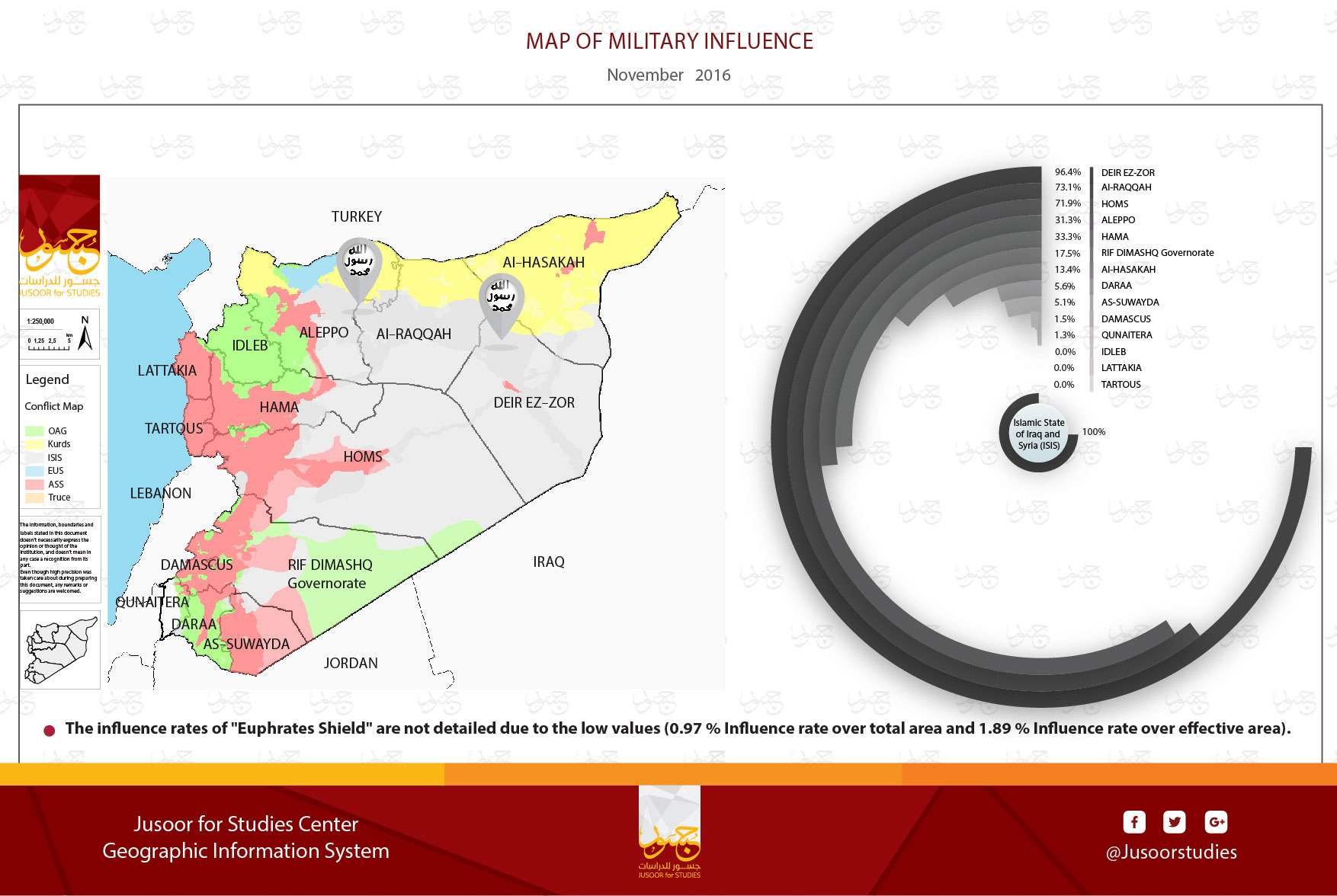 Jusoor for Studies issued the military influence map for November 2016, which showed that the ratio of total and effective controlling of areas by various fighting parties were different from the ratio in the map of October 2016.