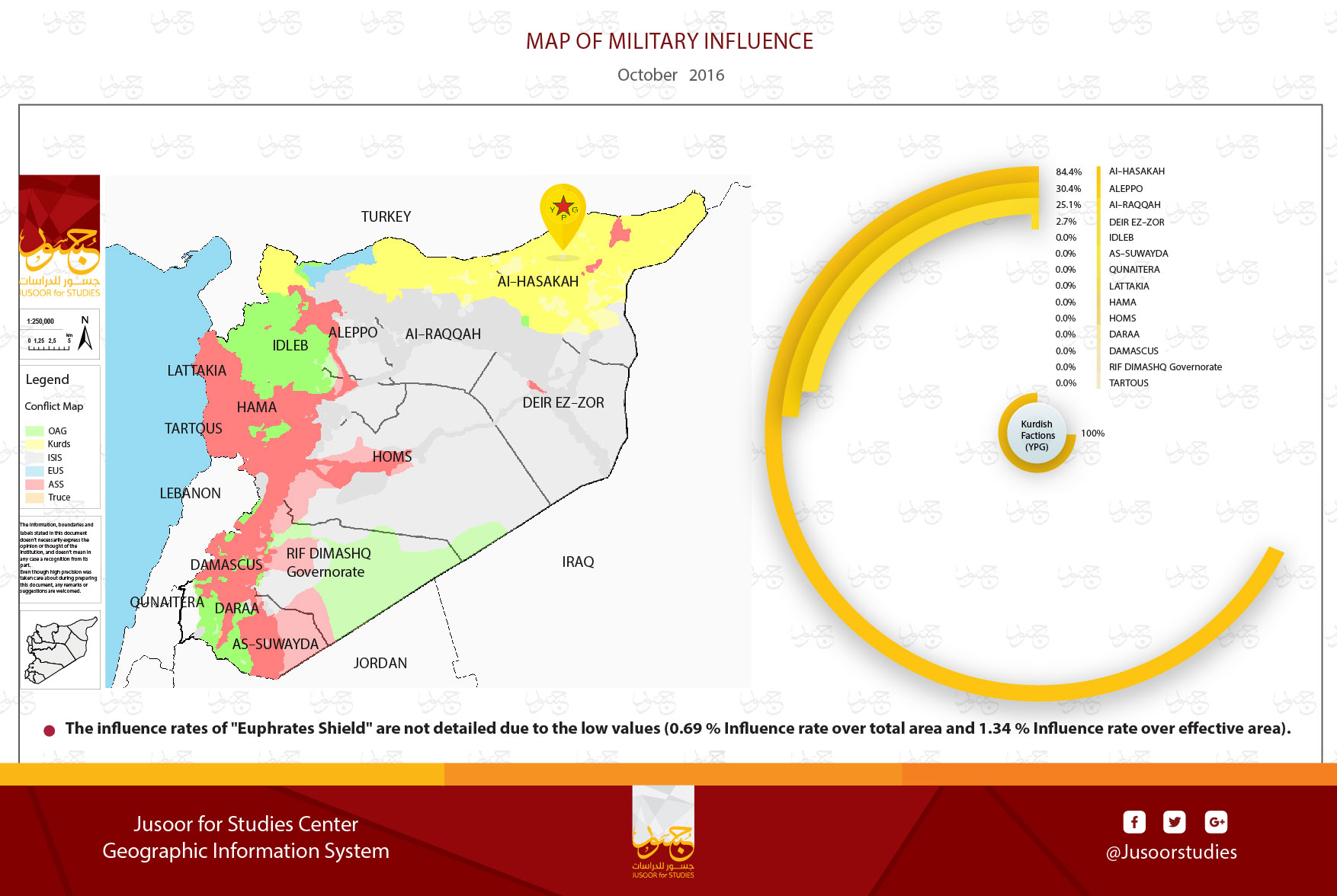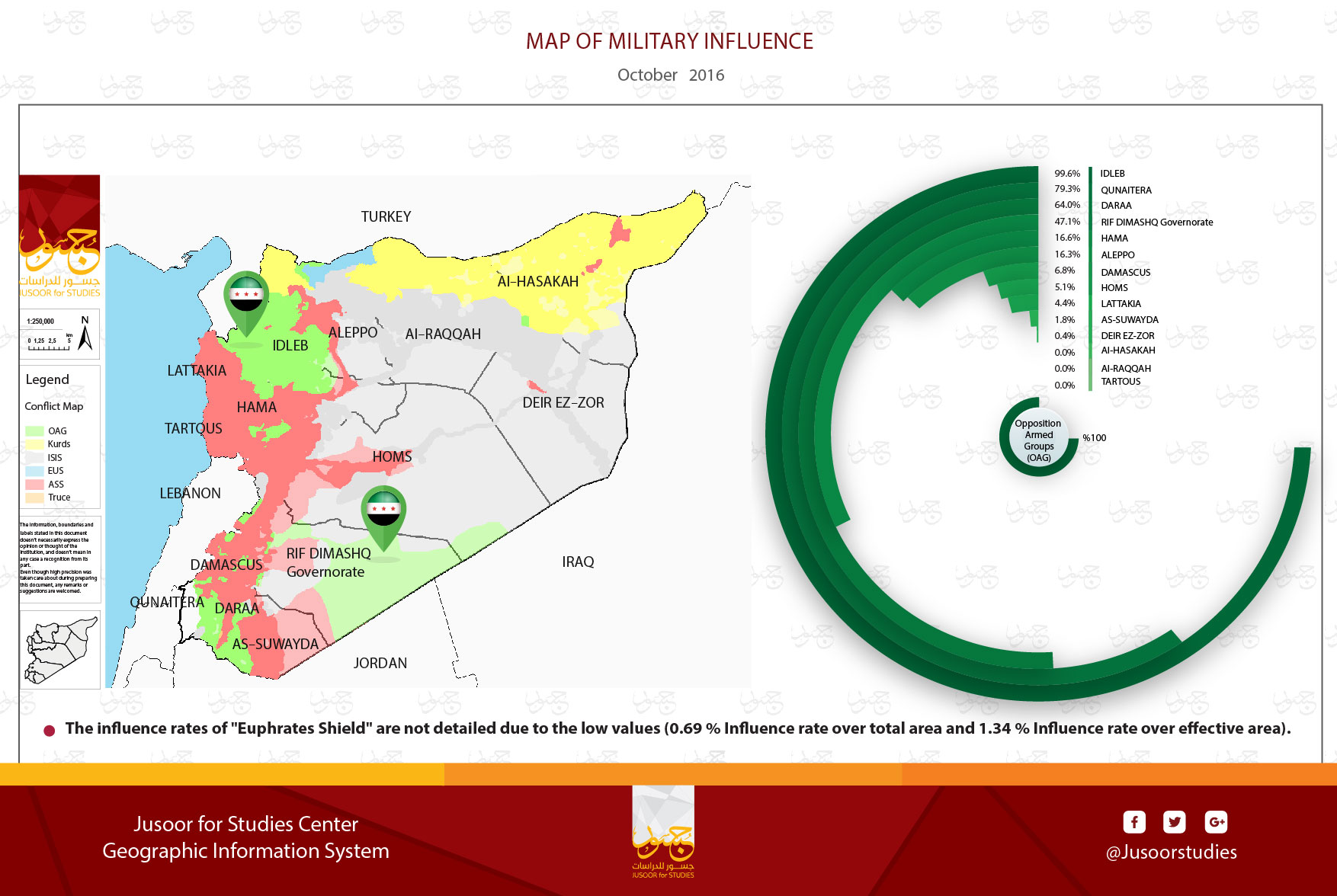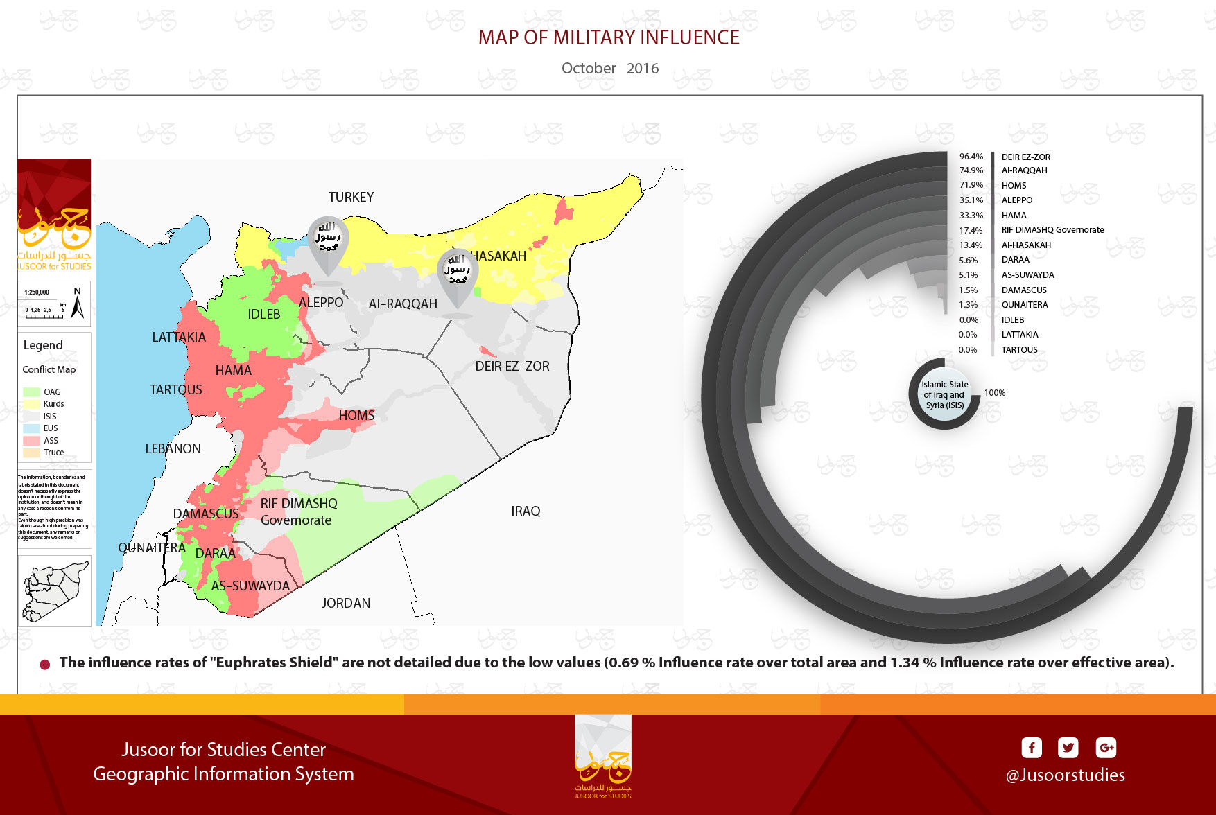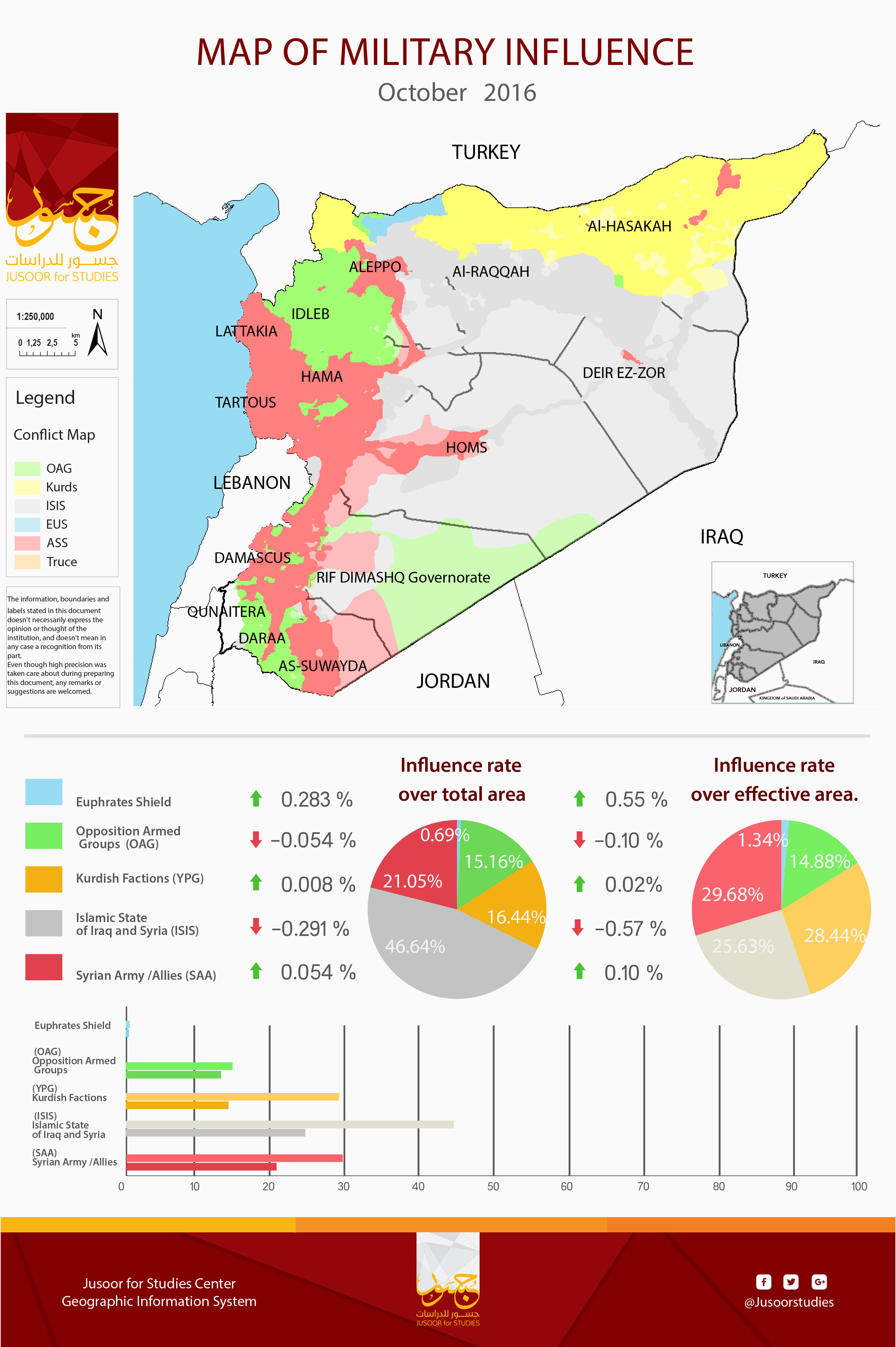 Jusoor for Studies issued the military influence map for October 2016, which showed that the ratio of total and effective controlling of areas by various fighting parties were different from the ratio in the map of September 2016.
