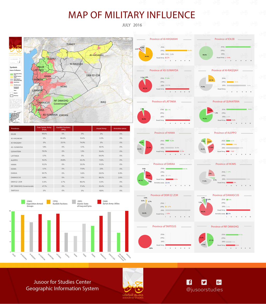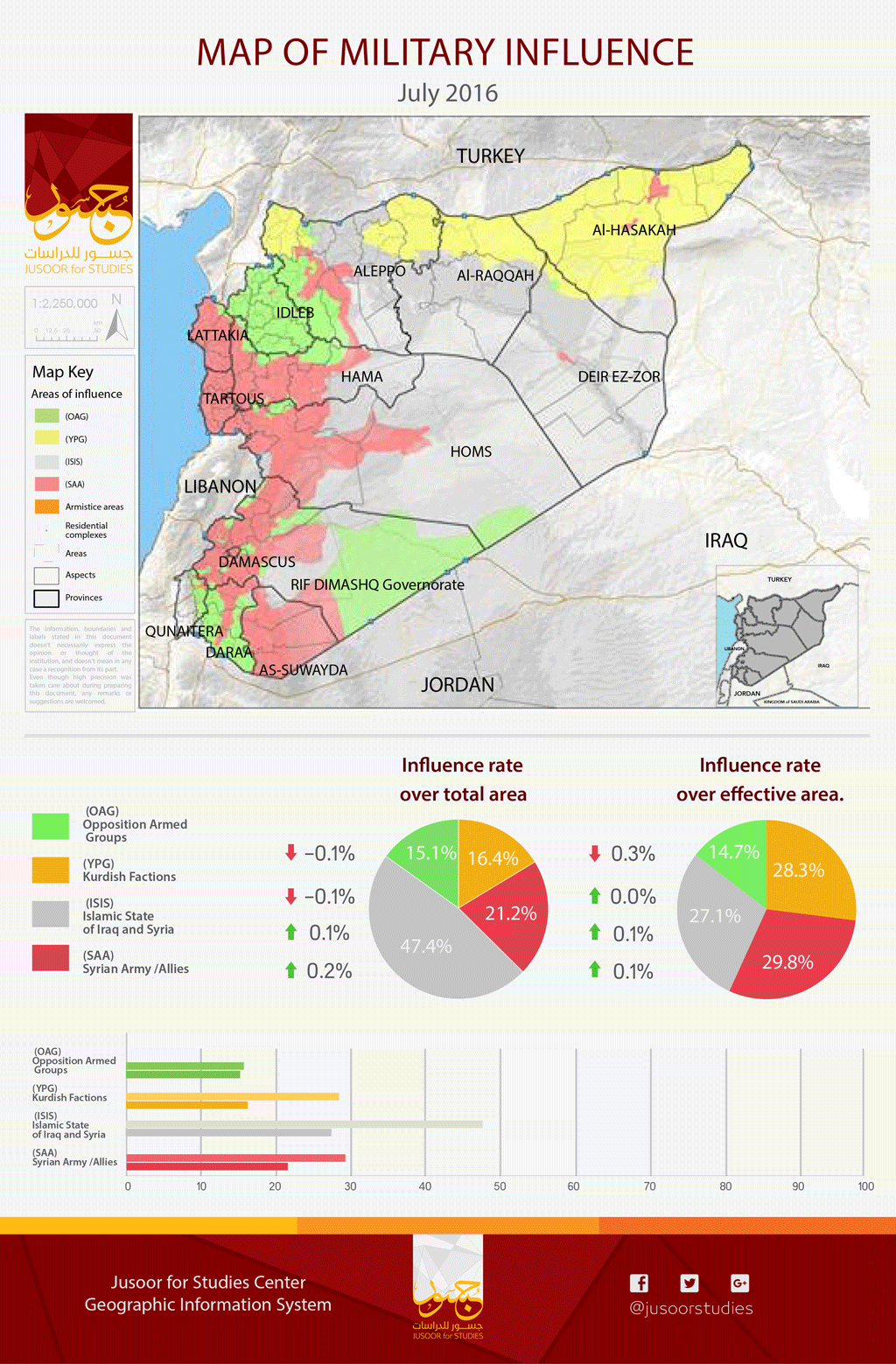 Jusoor for Studies center has released the Map of Military Influence of July 2016, which shows some variations in the Influence Rate over Total Area and Influence Rate over Effective Area compared to the Map Of Military Influence of June 2016.