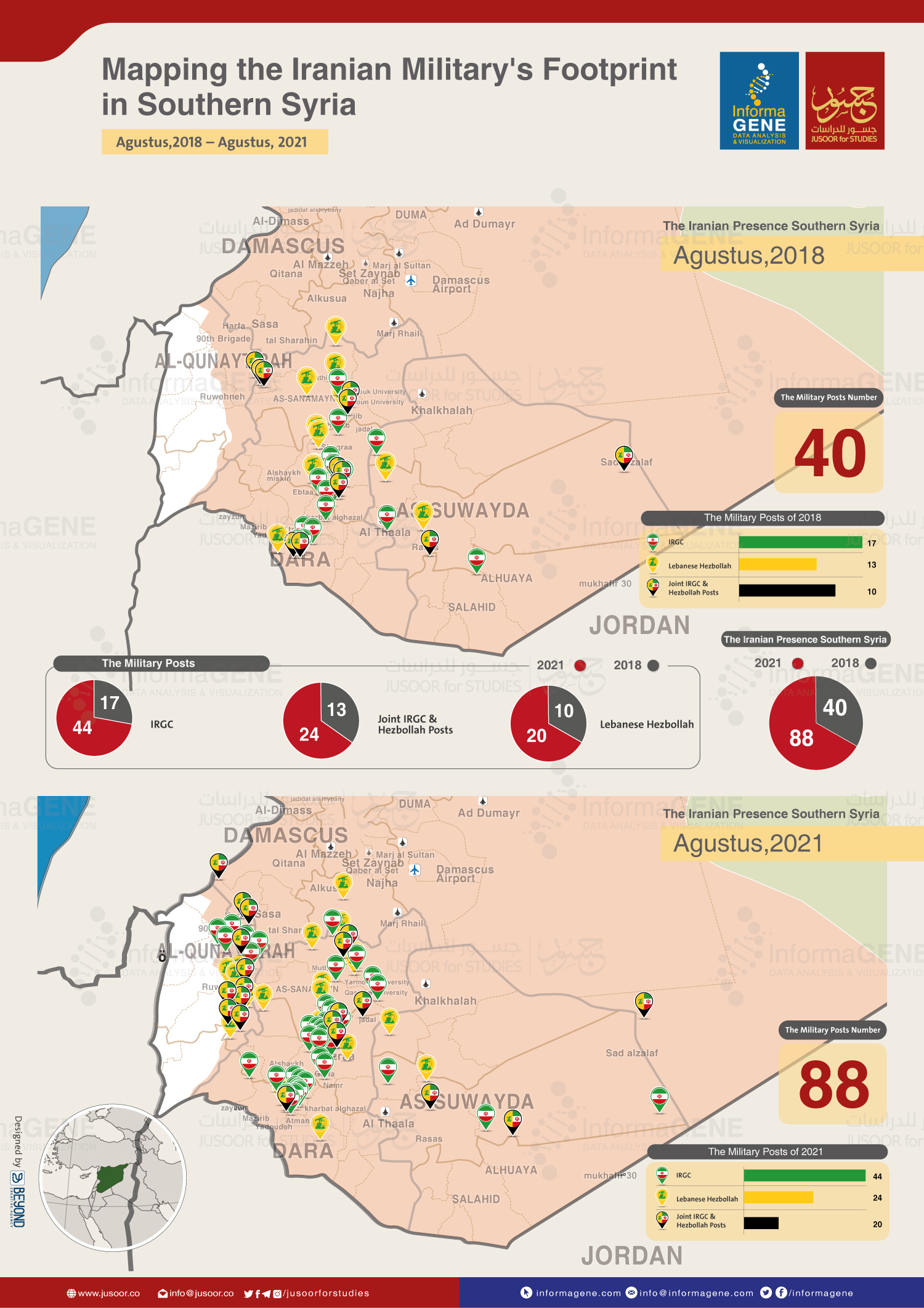 However, the current reality of the region is quite contrary to what was agreed upon between international actors on southern Syria, as outposts held by forces from Iran and IRGC-backed Afghan and Pakistani forces as well as those of the Lebanese Hezbollah, have more than doubled, rising from 40 security and military posts in August, 2018, i.e., immediately after the implementation of the agreement, to 88 ones by August, 2021.