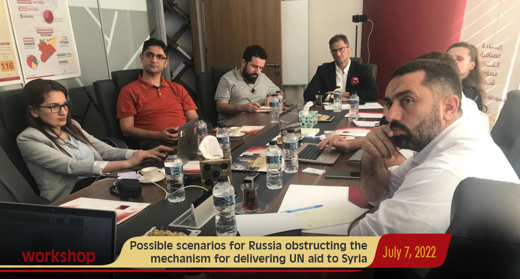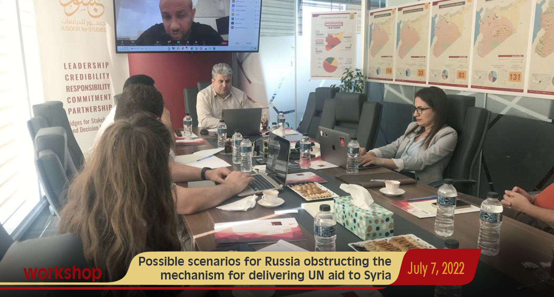 Just one day before the date of the Security Council vote to extend UN Resolution 2585, the Jusoor Center for Studies held a workshop on July 6, 2022, in which a group of experts, researchers and media professionals participated. Some of the participants physically attended the session within the Center's head office in Istanbul, while others, who live outside Istanbul participated using the Zoom App as a video conferencing means.