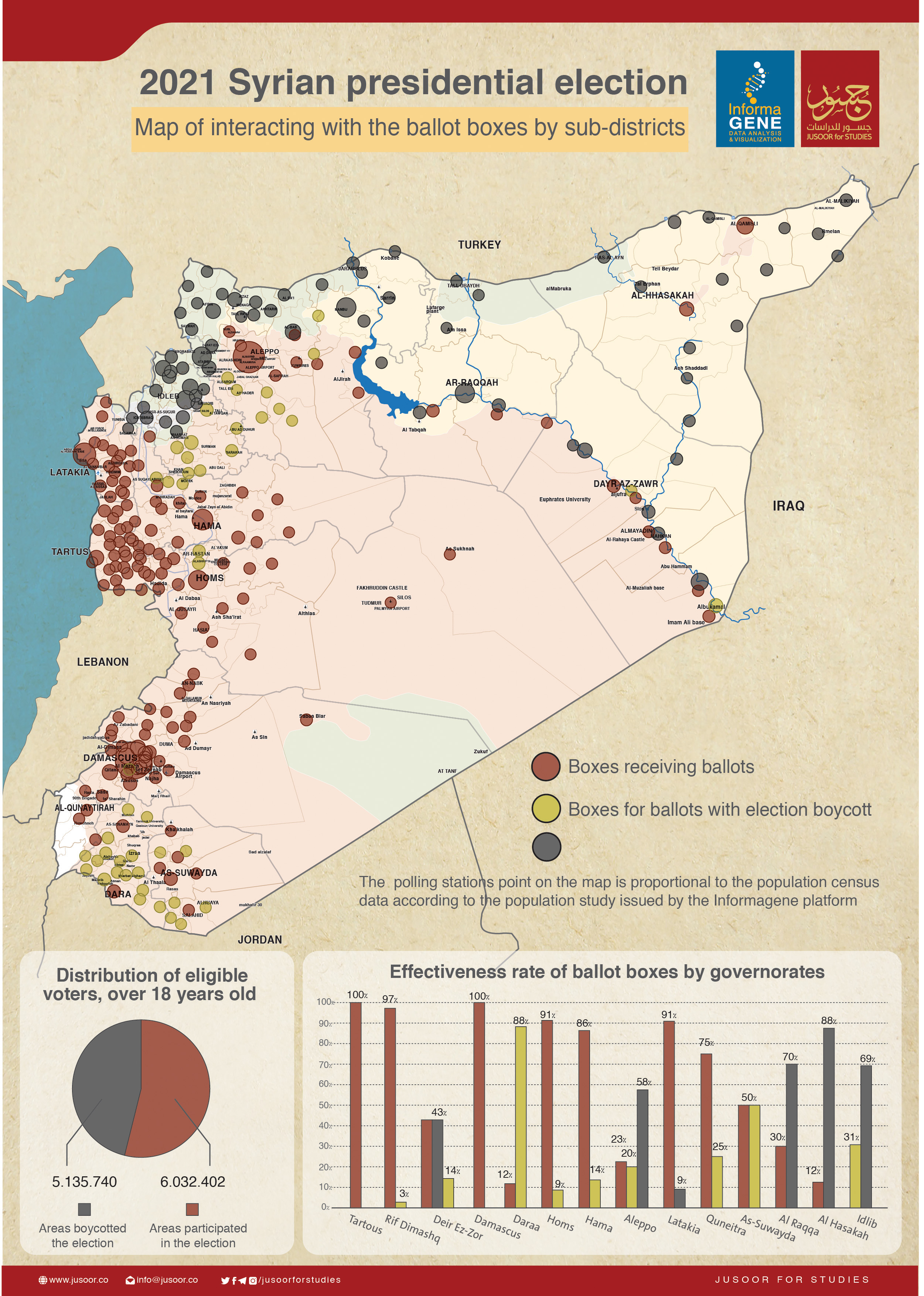 This report, issued by Jusoor Center for Studies in cooperation with the "Informagene platform for data collection and analysis", monitors interactions to the presidential elections in Syria, according to the official division of administrative units on the basis of the 270 districts.