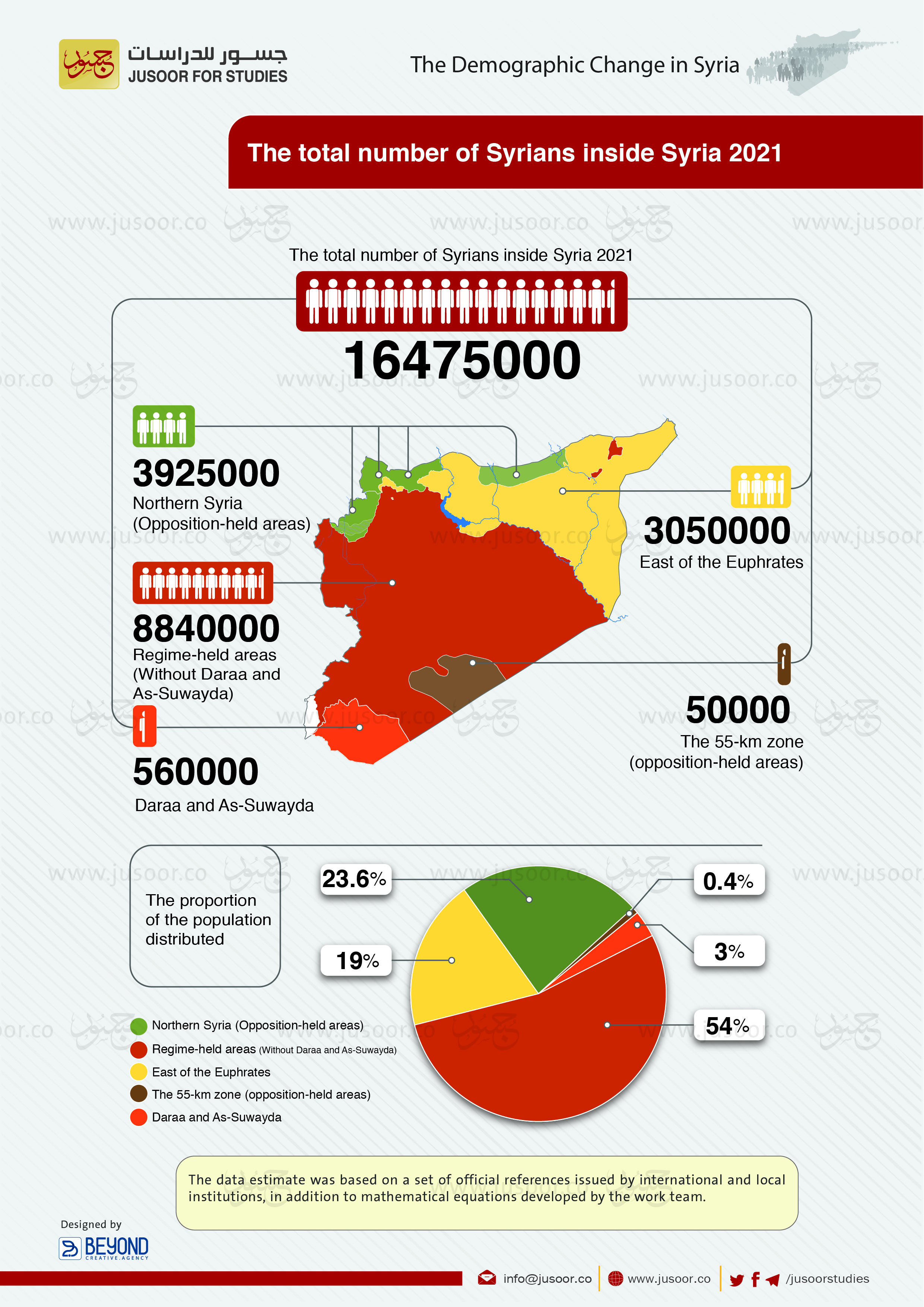 The figures of the displaced and people living outside Syria in the post-2011 period were prepared based on data from the United Nations and other international organizations, official data from the countries in which the Syrians reside, and at least one local source in each country, in addition to weights, using expert opinions.