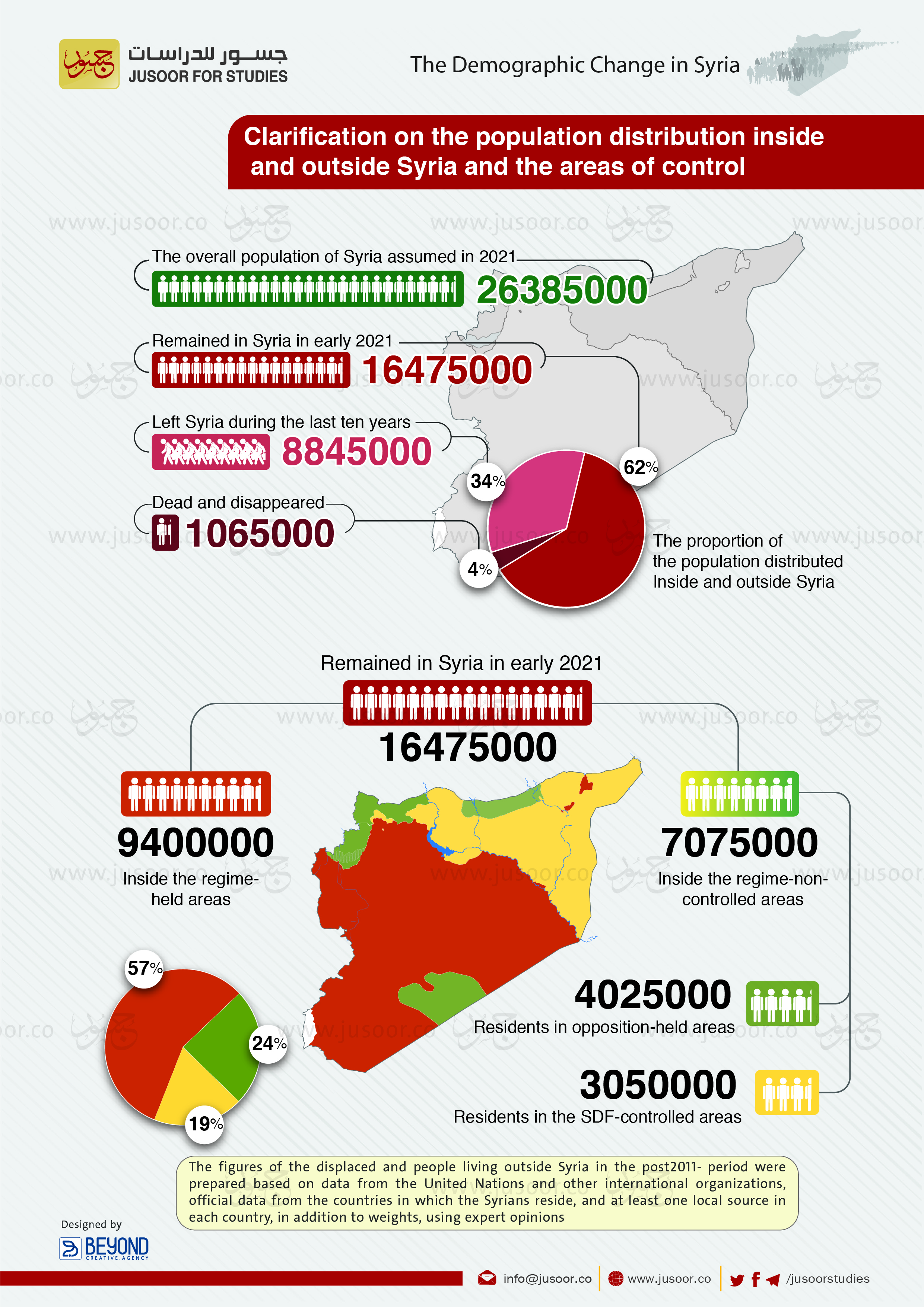 In 2021, the number of the population in Syria was considerably changed as a result of the conflict that broke out in 2011, after the Syrian regime used excessive force against the peaceful protests and while the conflicting parties were struggling to seize control over areas, as displacements took place and agreements were held that led to the departure of large numbers of the population, and the economic and living conditions forced a large number of people to leave Syria.