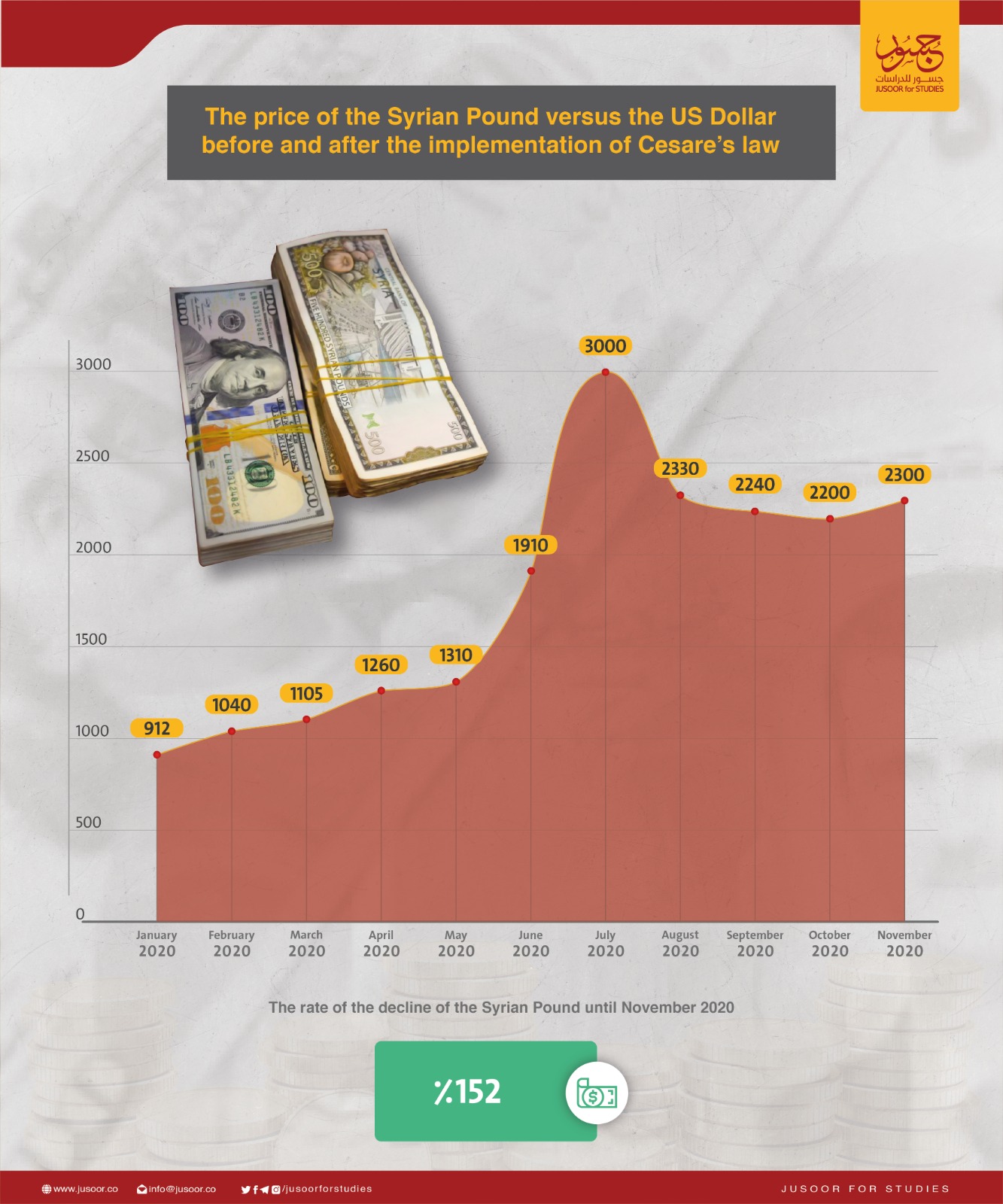 The price of the Pound against the USD witnessed a significant decline prior to the Caesar Act entering into force in early June. It reached more than 3,500 Pounds per USD, prompting the security services to increase their control over the markets, ensure the implementation of the above decrees, and stress that the Money transfer offices pay the amounts in the Syrian Pound exclusively for the Pound to return and settle below 2000 Pounds per USD.