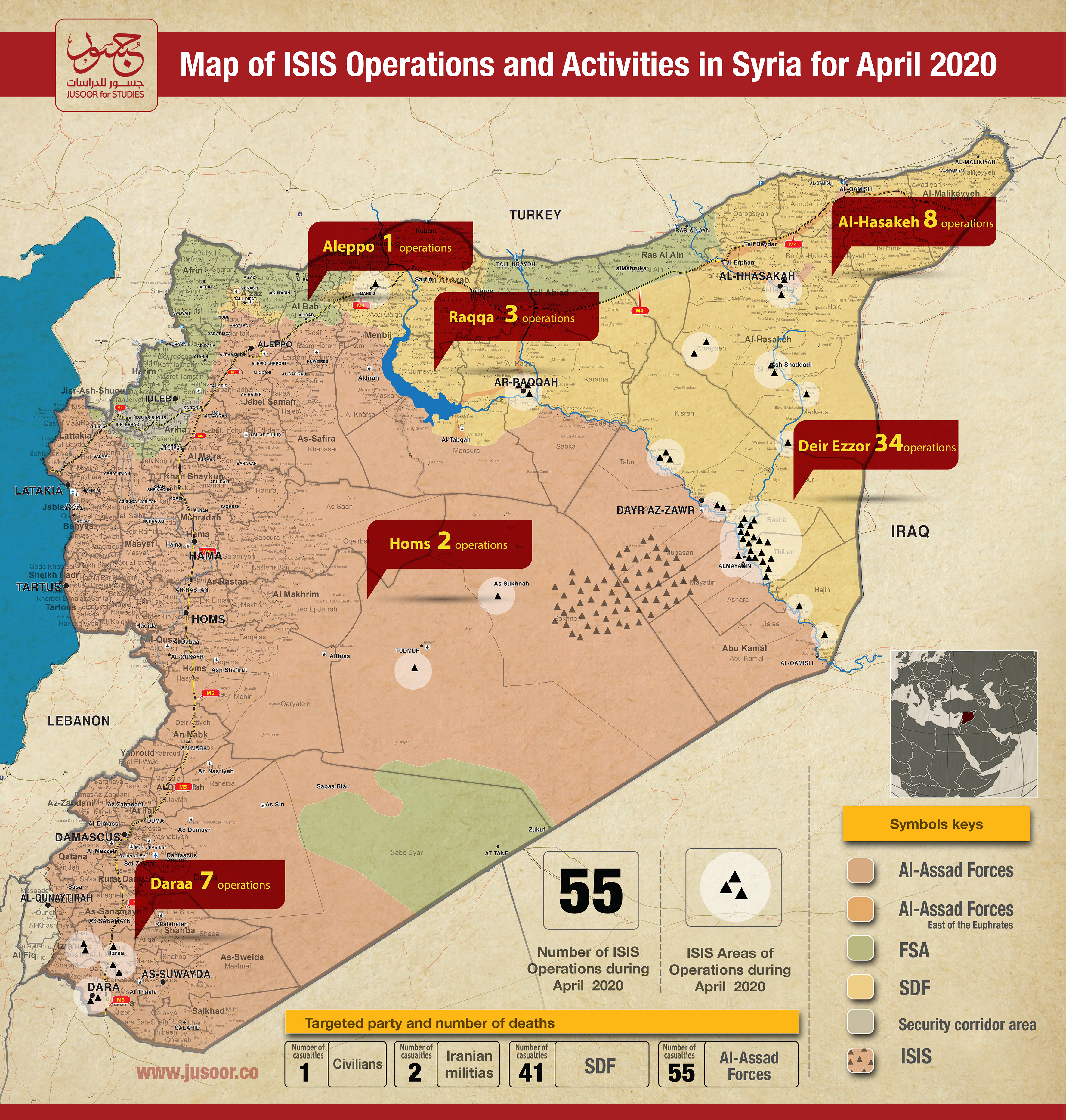 In April, ISIS carried out 55 different military operations marking a slight increase compared to the 44 operations carried out in March 2020. The majority of these operations (34) were carried out in Deir Ez- Zor, while 8 operations were carried out in al-Hasakeh Province, 7 in Daraa and in 3 in Raqqa, 2 in Homs and one in the city of Manbij in the eastern countryside of Aleppo.