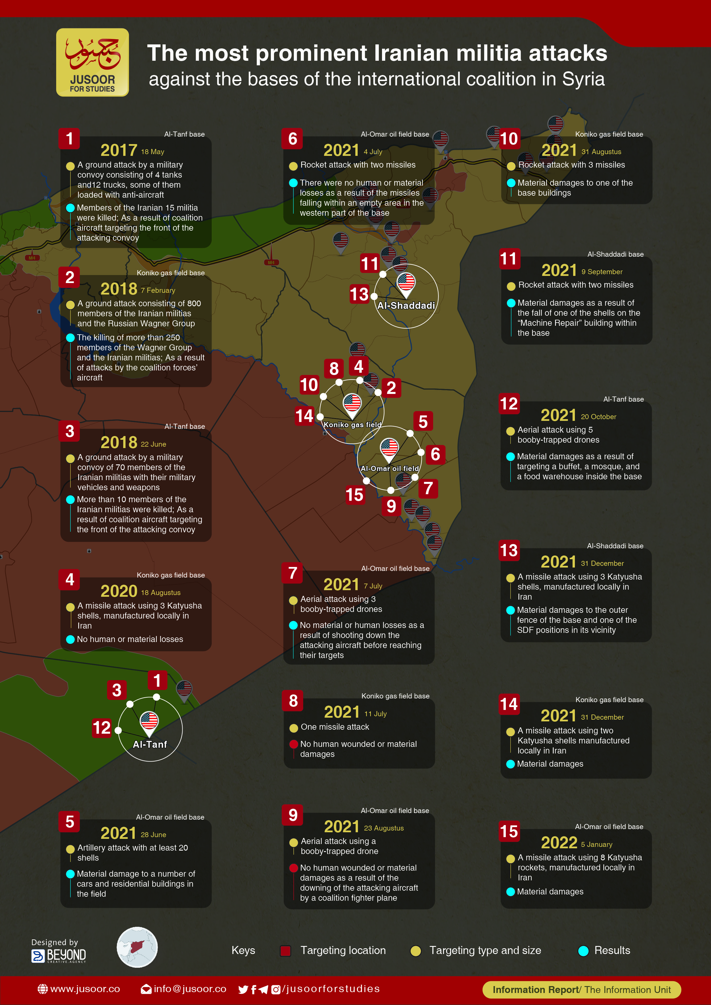 Accordingly, this report reviews the nature of the relationship between the two parties in Syria and monitors the most prominent previous attacks carried out by Iranian militias against the bases of the international coalition in Syria. Then, the report then moves to focus on the recent escalation by reviewing its details and the implications and motives for participating in it.