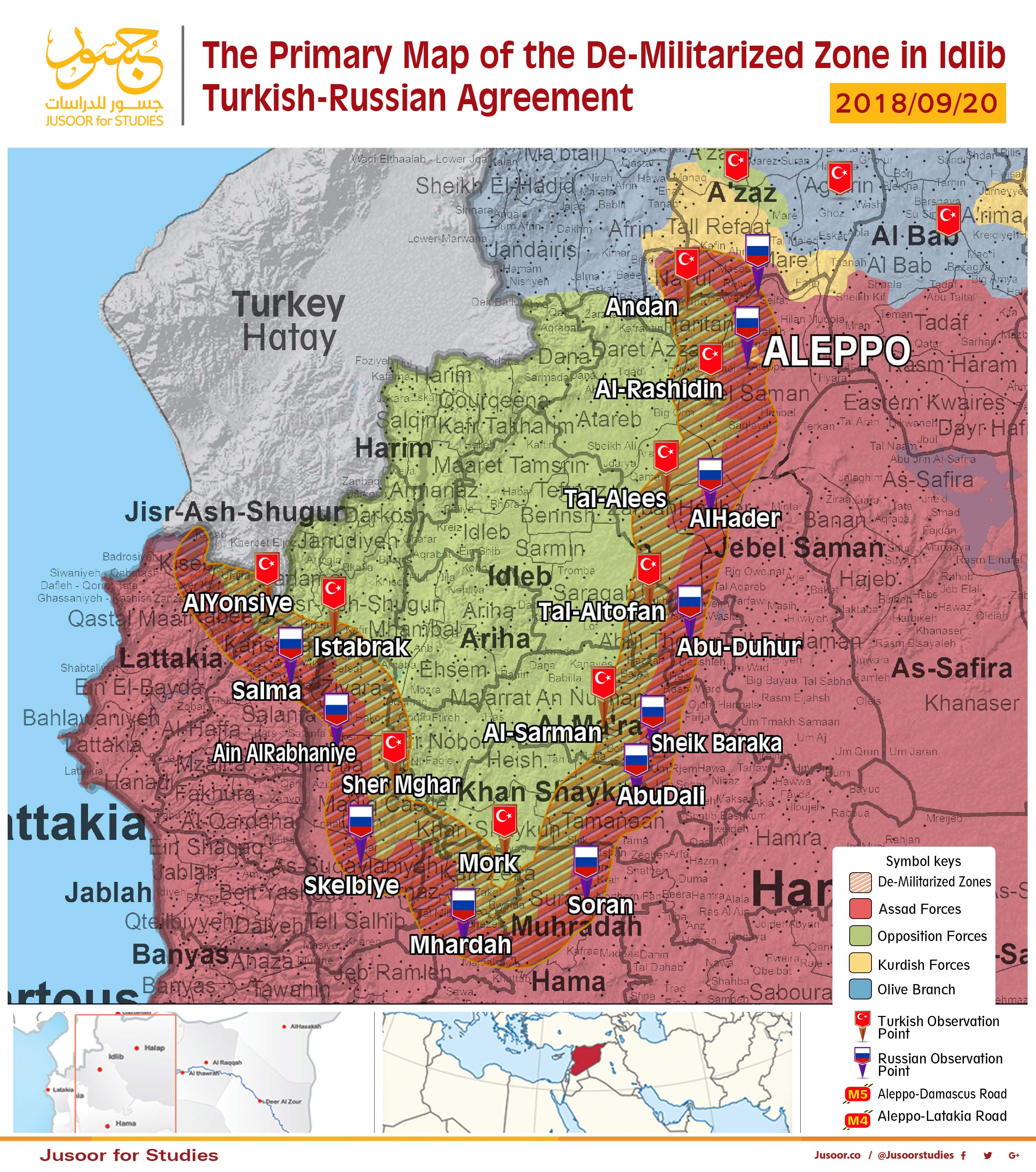 The map issued by Jusoor for Studies center explains the potential shape of the de-mitilarized zone which has been agreed upon in the Sochi agreement on 17th of September between president Erdoğan and president Putin.