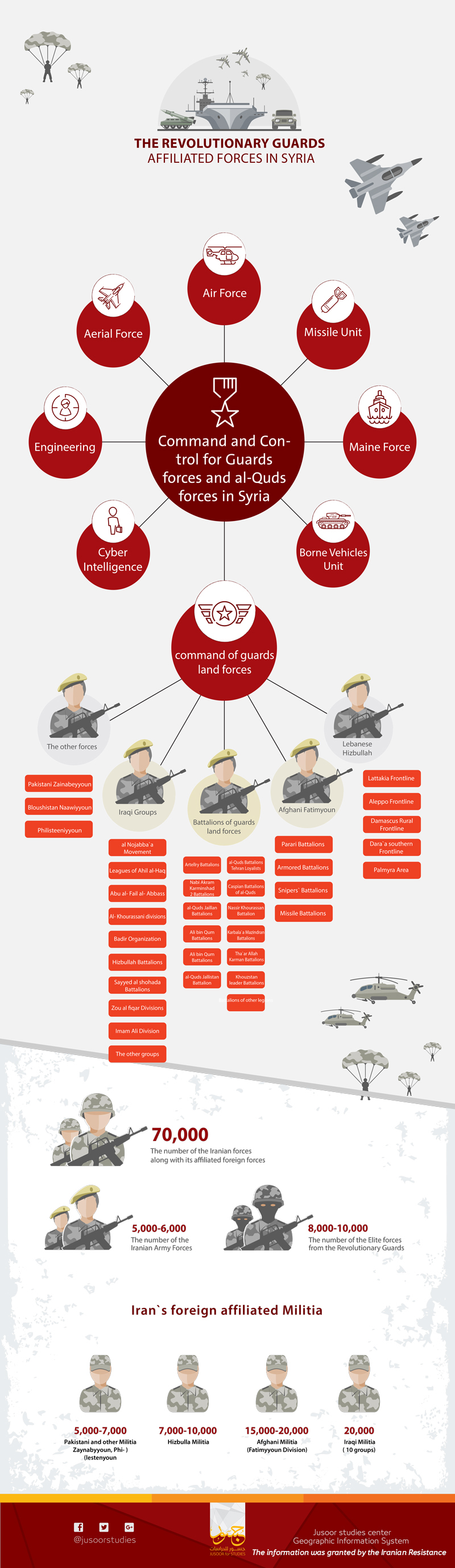 In a documentation of its own kind, the IRANIAN RESISTANCE has specified the location of IRANIAN forces in different SYRIAN's Governorates, which has been represented in this visual infograph by JUSOOR fo STUDIES to reach a bigger spectrum of people.