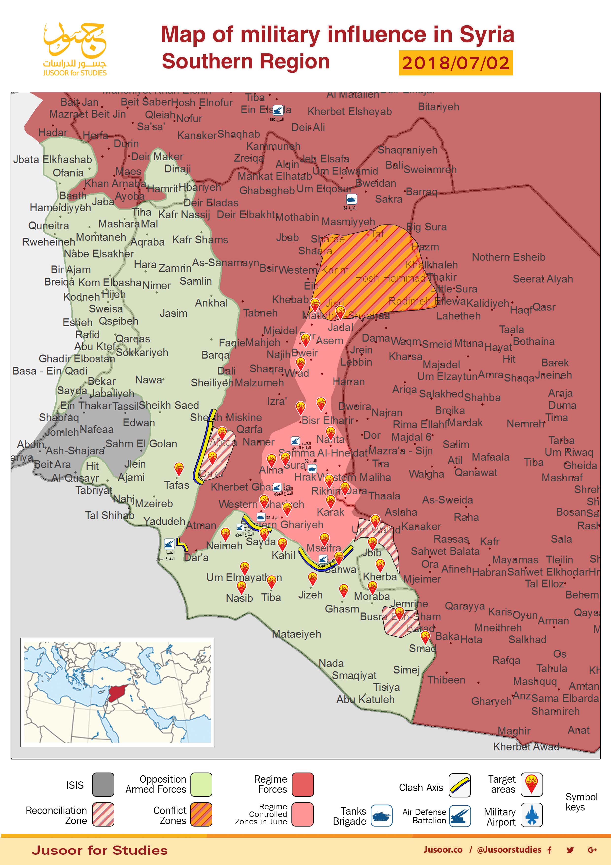 The southern battle is considered very important for local and international actors including the regime, the opposition, Russia, Iran, the United States, Israel and Jordan. In this section, we present a review of the importance of the battle for these various actors and the effect the battle has on their interests in the south.