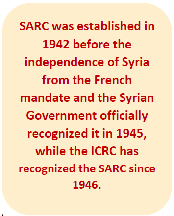 The Syria Arab Red Crescent (SARC) is considered one of the largest humanitarian aid organization in Syria and was established by the republican decree No. 540 of 1942 before the independence of the Syrian state from the French mandate in 1943. The humanitarian organization was registered in the Ministry of Labour and Social Affairs in Syria in order to have an official status, where the International Committee of the Red Cross (ICRC) was the only official humanitarian organization in Syria that time, which was established by France. In 1945, the Syrian Government officially recognized the SARC and became an alternative for the ICRC, and the latter has officially recognized the SARC by Circular No. 375 of 1946.