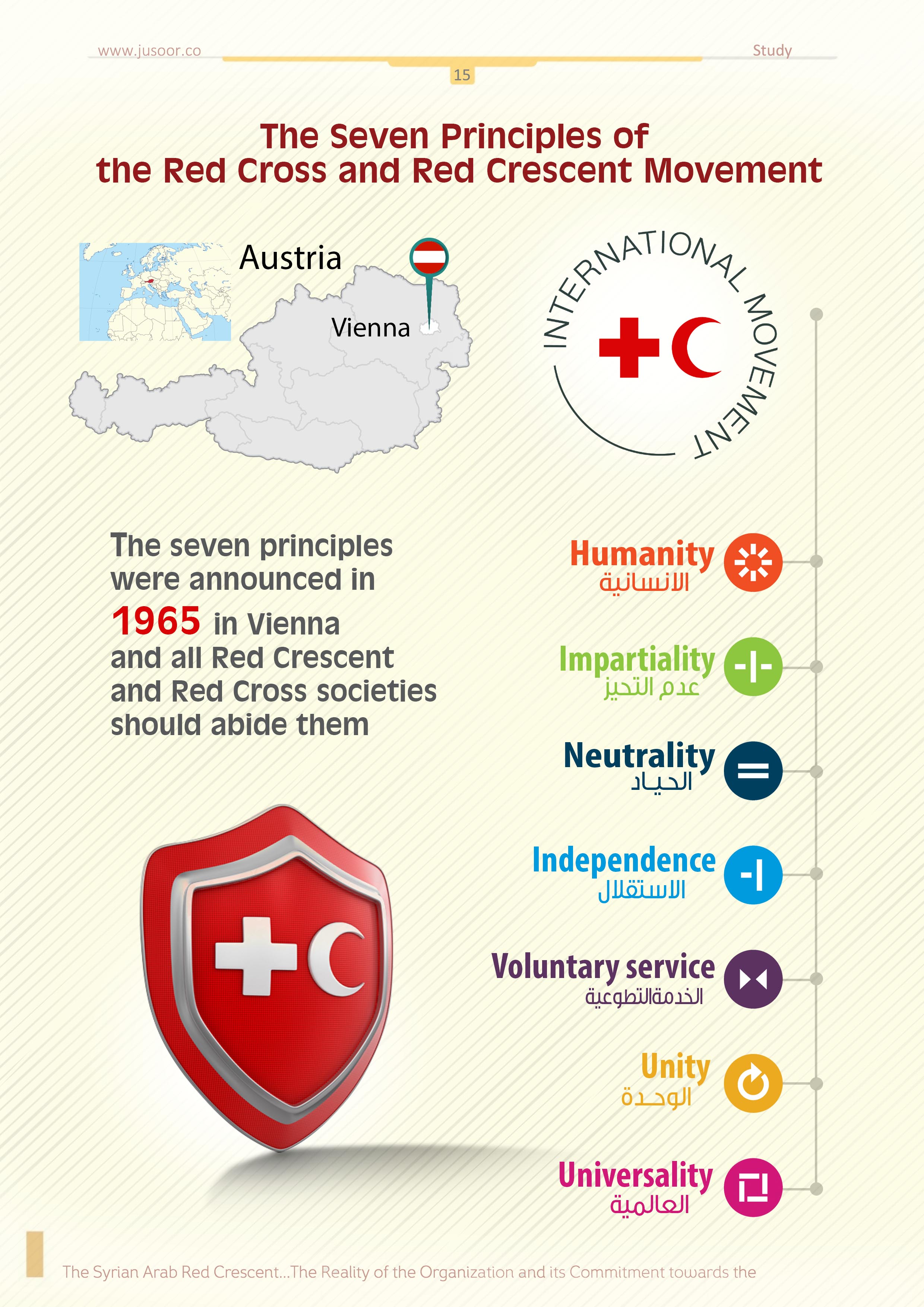 • The seven principles (announced in Vienna in 1965) represent the common bond between the national Red Cross and Red Crescent societies, ICRC, and IFRC. And thus, all organizations that are included in the IFRC should abide those principles, which are as follows: Humanity, Impartiality, Neutrality, Independence, Voluntary, Service, Unity, and Universality.