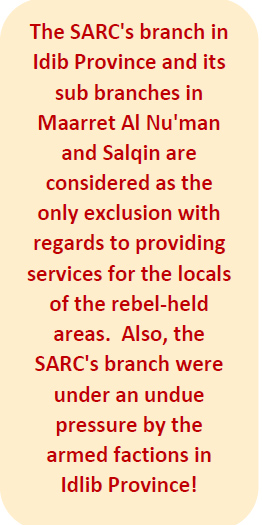 On the other hand, the SARC’s medical and food aid in the Syrian regime’s areas have declined considerably, while Jaish Al-Fatah prevented the SARC’s branch in Idlib from importing any relief items from the Syrian regime’s areas and has tried to close this branch many times, but locals stood against these attempts because of the services provided by this branch. It is worth mentioning that the Turkish Red Crescent has supported the SARC’s branch in Idlib Province thus, the head and staff of this branch have become wanted by the Syrian security forces.