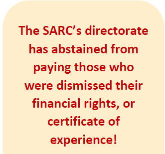 The SARC’s Directorate has abstained from paying the late salaries, giving severance pay, giving a certificate of experience, or even presenting recommendation letter for those who quit, dismissed, or under detention in order to prevent them from working with other relief organizations abroad or in the Syrian opposition’s areas.