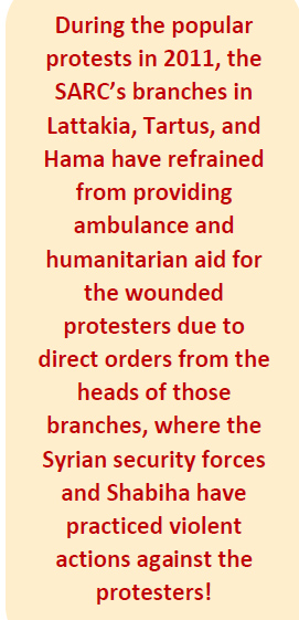 Since the beginning of the popular protests in 2011, the SARC has continued its activities in most of the Syrian provinces, but the SARC’s branches in Lattakia, Tartus, and Hama have refrained from providing ambulance for the wounded protesters due to direct orders from the heads of those branches, while the response of the SARC’s branches in Aleppo and Damascus and other provinces was limited.