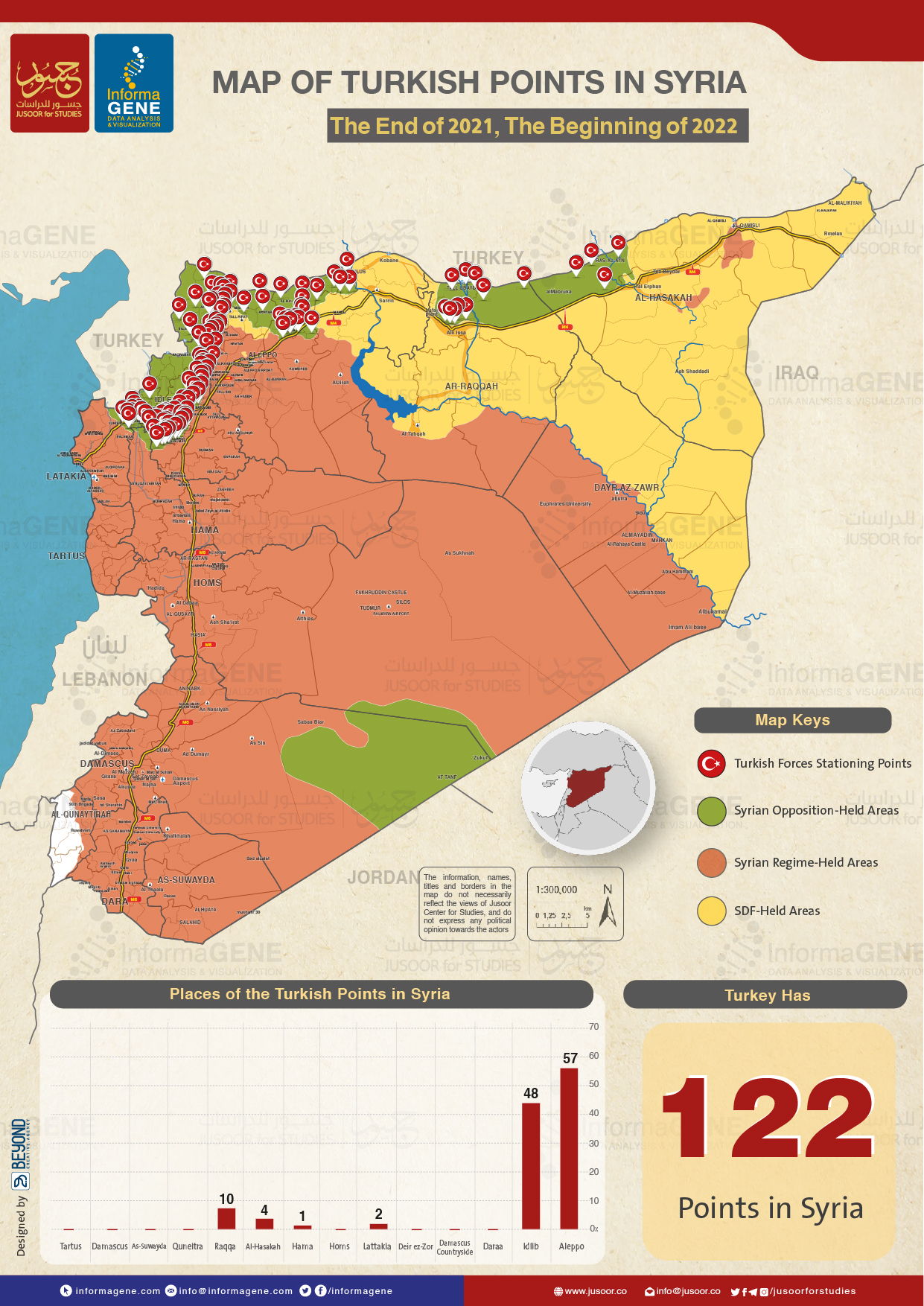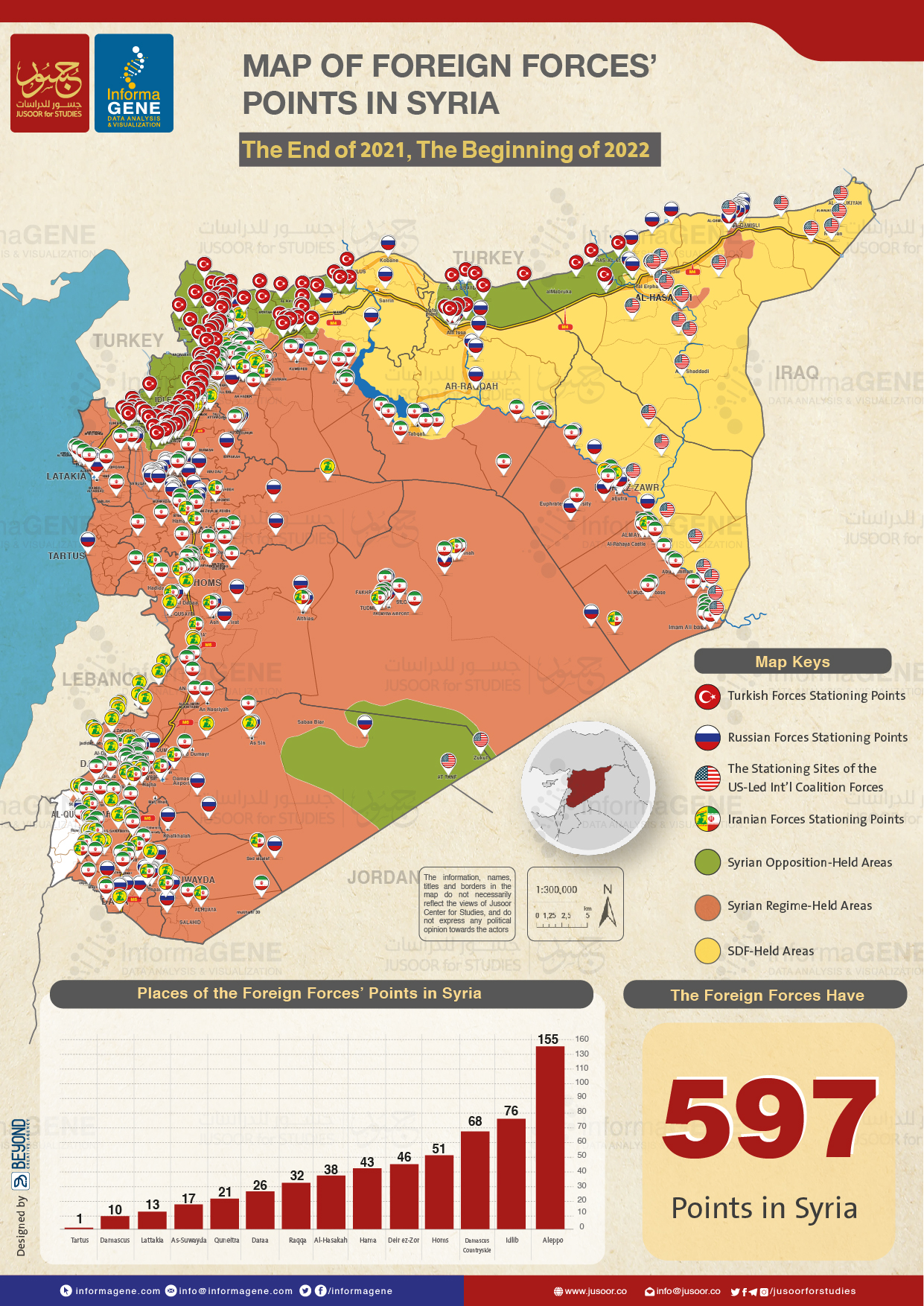 Jusoor Center for Studies, in cooperation with the InformaGENE Platform for Data Analysis and Visualization, publishes analytical maps on the security and military points of the various external powers directly intervening militarily in Syria. By the beginning of 2022 the number of foreign security and military sites, bases and posts, reached nearly 600 ones. This figure, in fact, reflects the large influence the external parties have in the Syrian file, at the expense of the weak internal influence of all local actors.