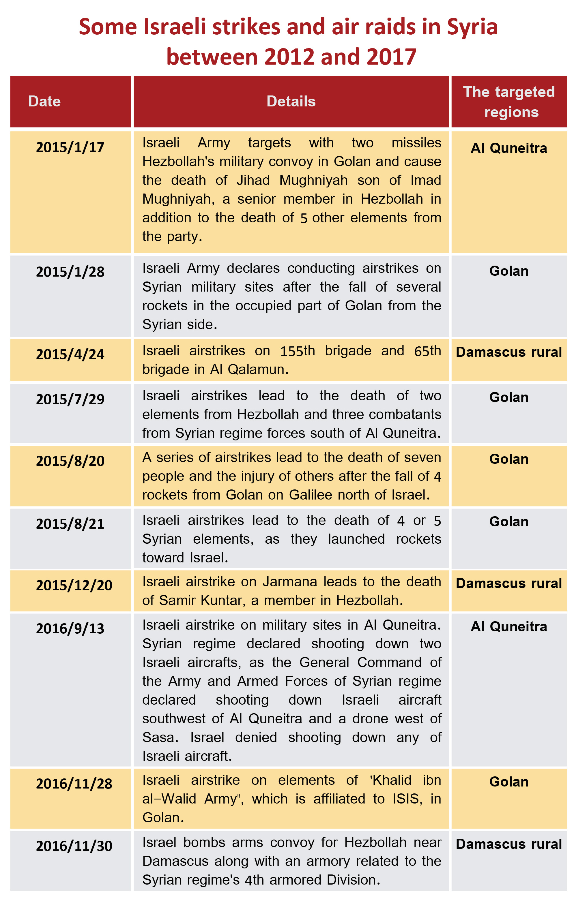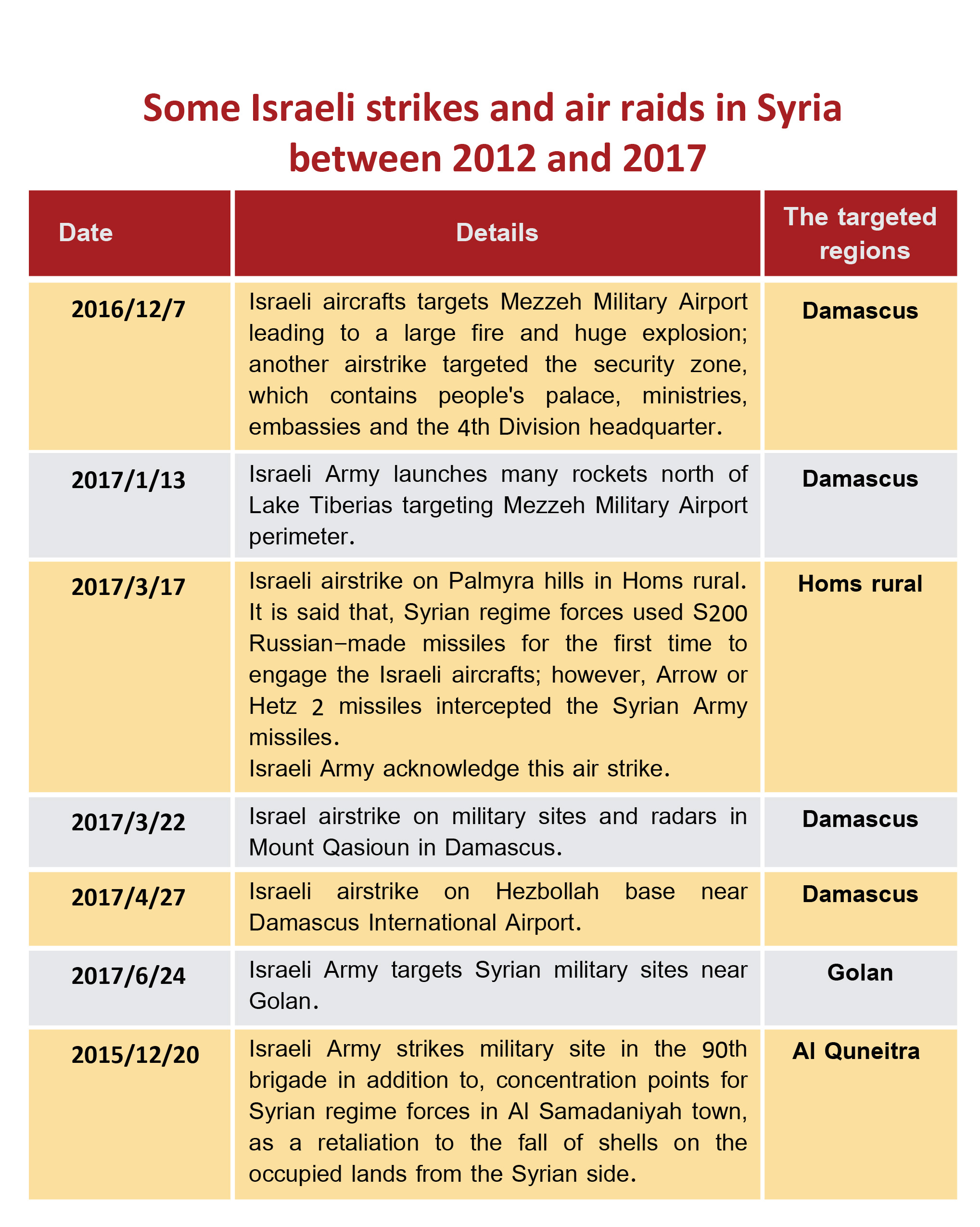 The frequency of Israeli attacks has increased since 2013 with no coverage from Syrian regime media or its allies' media except some of them, as strikes took place in Damascus and was hard to be ignored like the one that targeted the 4th armored division in Mount Qasioun.