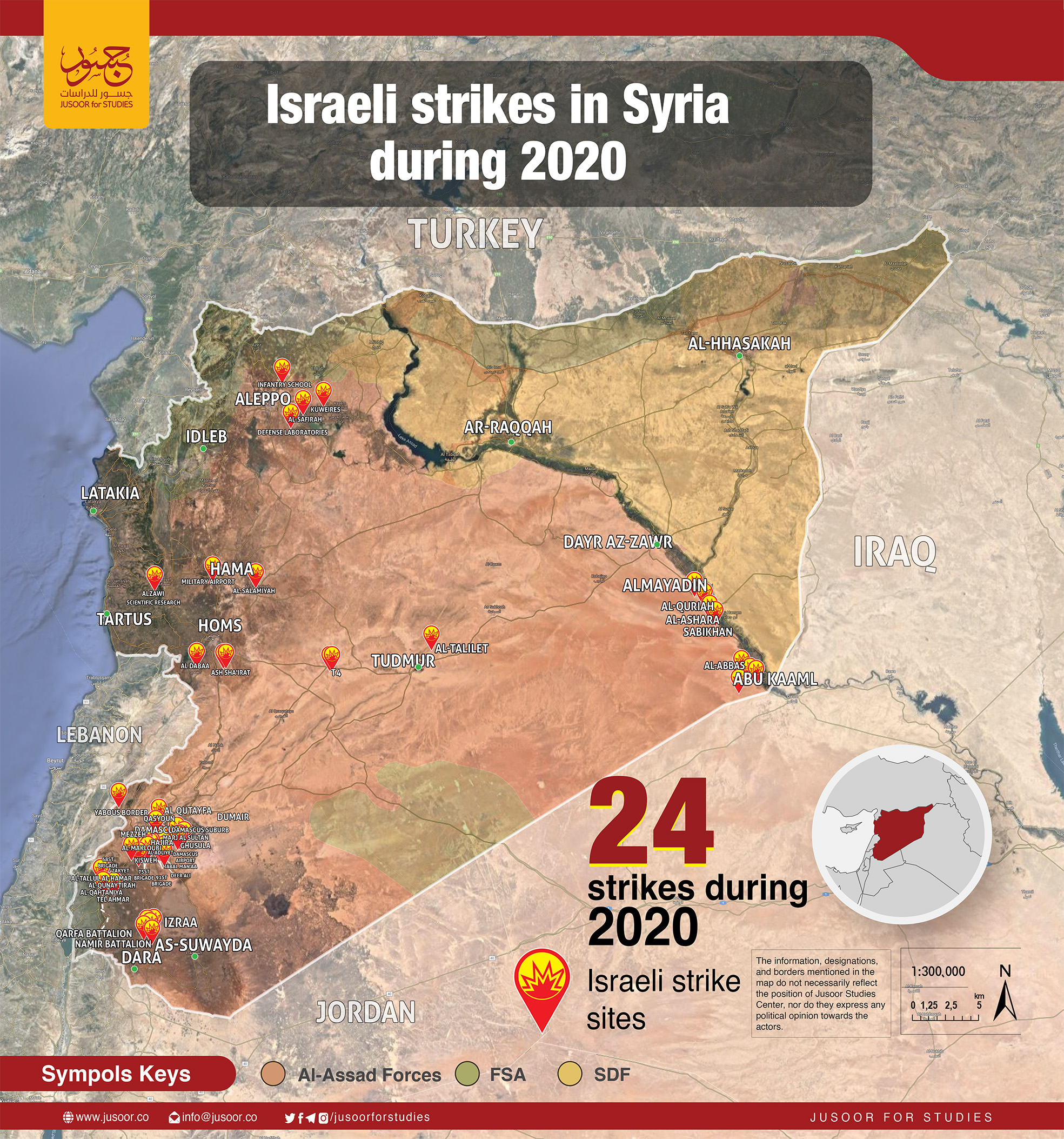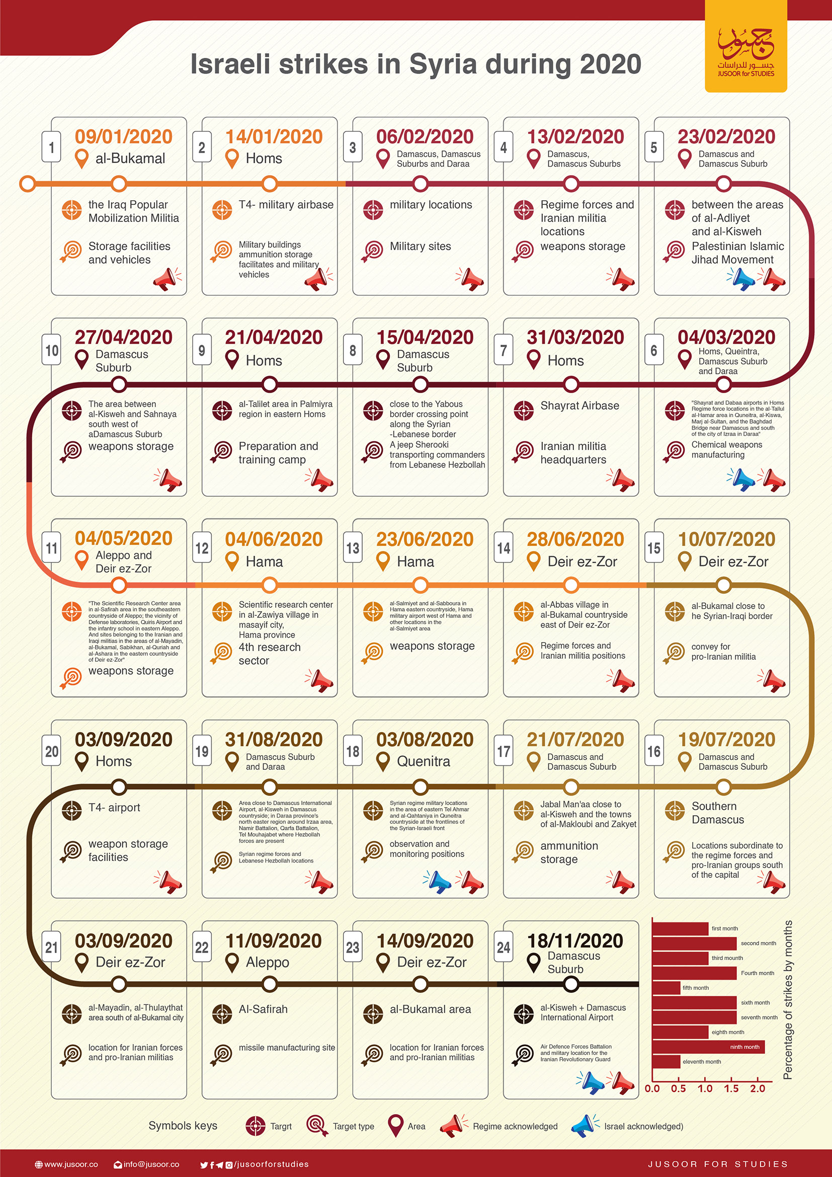 Jusoor for Studies Center documented 24 Israeli airstrikes on Syrian regime and Iranian locations during 2020. The most recent airstrike was carried out on November 18, which targeted an Air Defense battalion and Revolutionary Guard military locations in Damascus countryside.