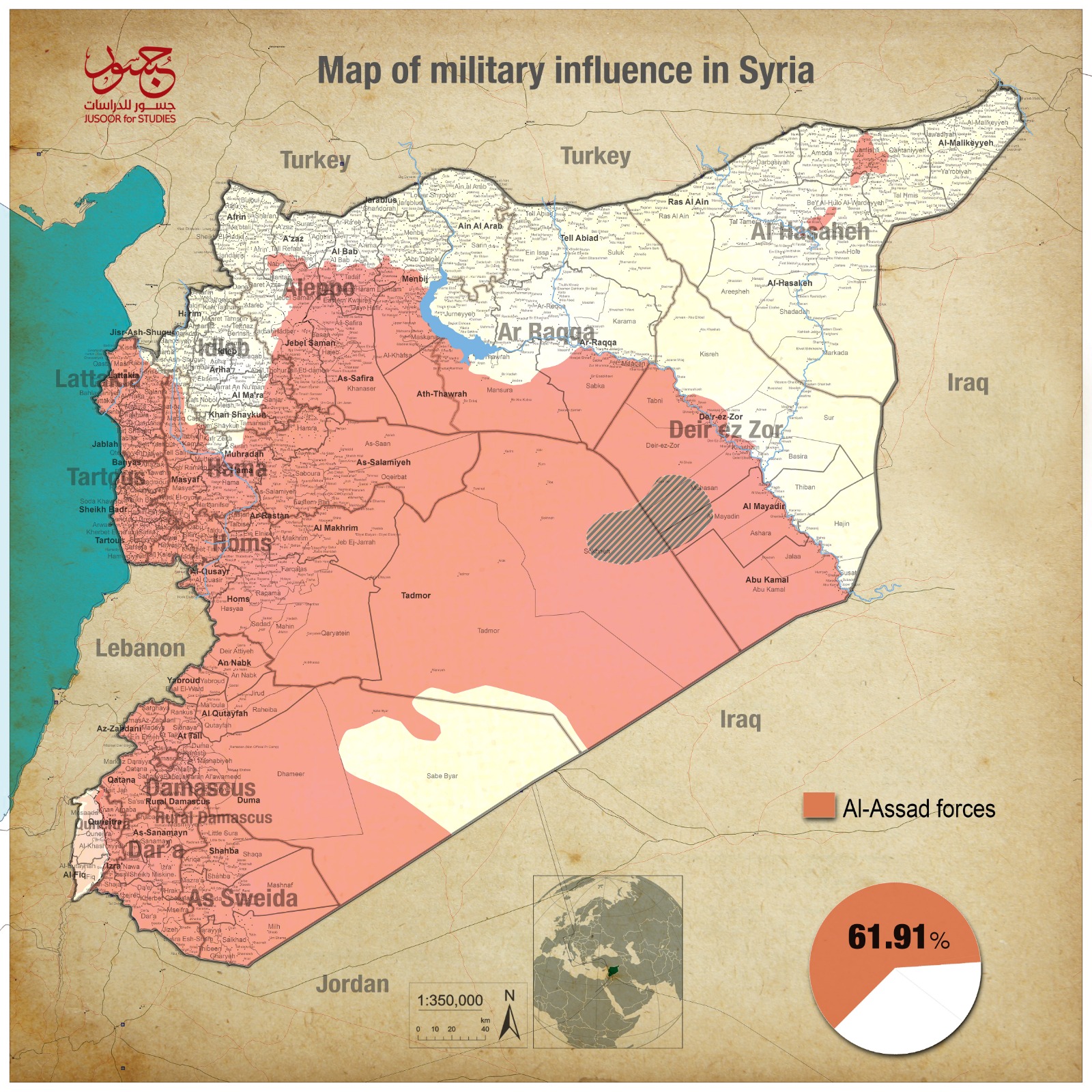 According to Jusoor for Studies monthly released map, the Syrian regime’s control ratio became (61.91%) compared to (61.88%) recorded last month. This slight increase came in part at the expense of the opposition factions, which now control (10.25%) of the Syrian land, compared to (10.30%) ratio recorded since August 2018.