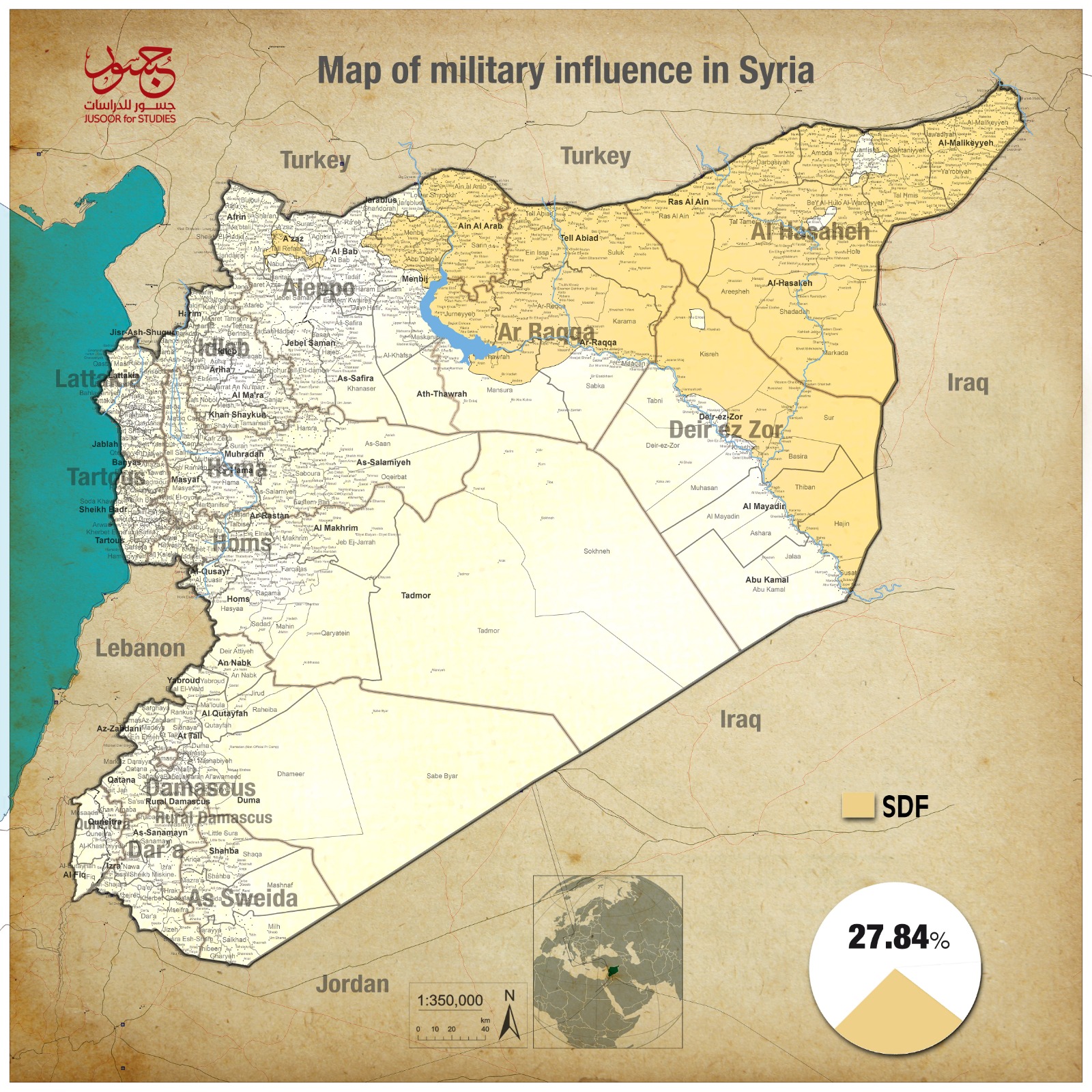 The Syrian democratic forces (SDF) control ratio has slightly decreased to (27.84%) compared with (27.92%) recorded since January 2019.