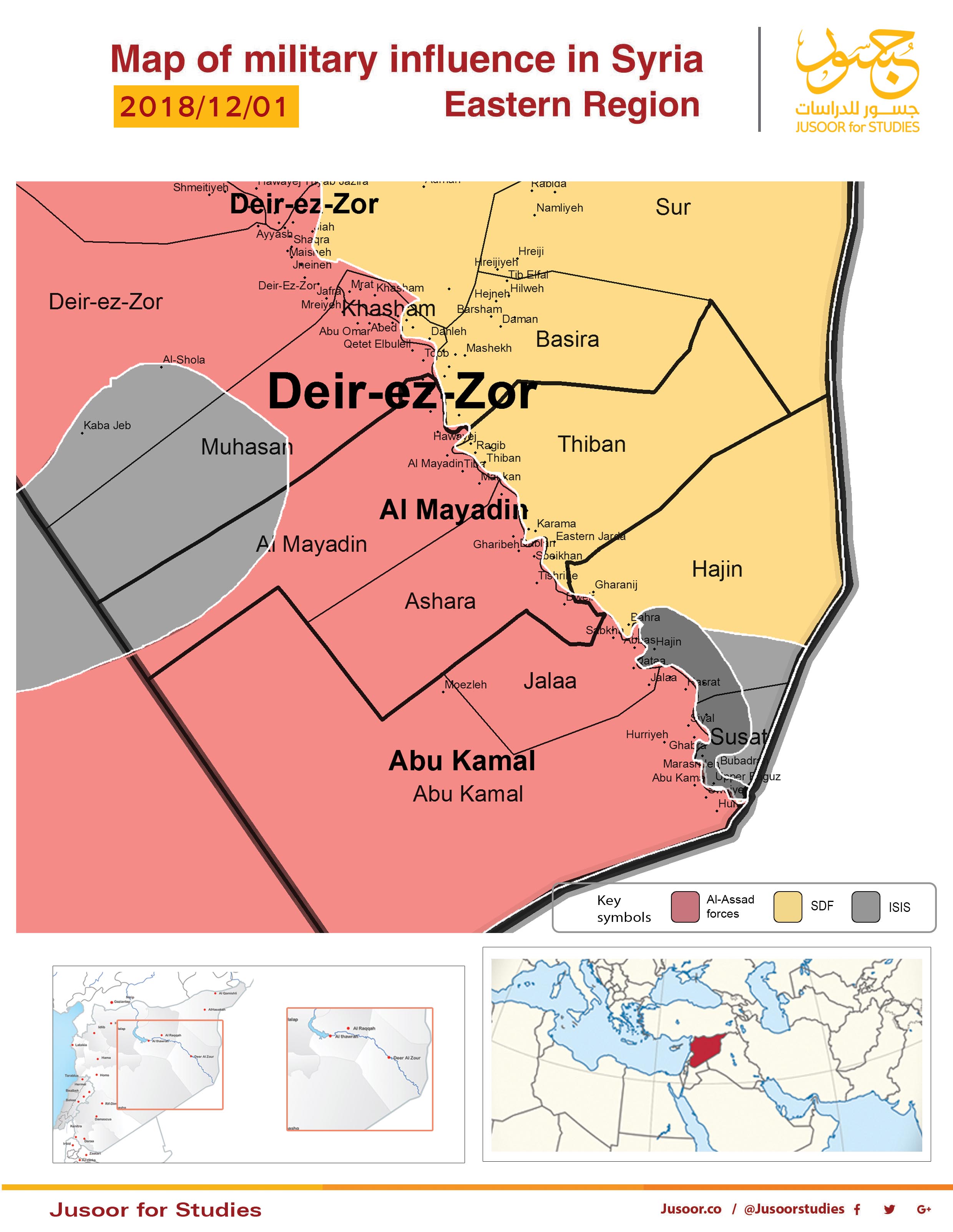 Syria map of military influence for November 2018 showed stability in terms of the total control ratio among most of the conflicting forces, despite the fact that some military movements and battles have taken place in some areas. The most prominent battles were between Syrian Democratic Forces (SDF) and ISIS and another battle between ISIS and the Syrian regime. Nonetheless, these battles did not affect the areas of control for any of the parties.