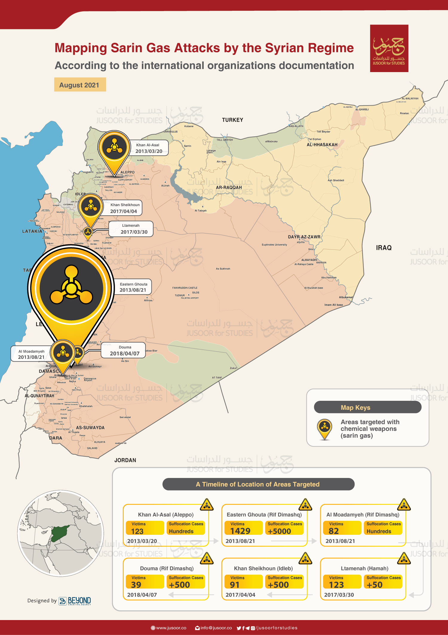 On August 20, 2021, Jusoor Center for Studies issued a map showing the areas that were subjected to the largest attacks launched by the Syrian regime with chemical weapons ever, using the internationally banned Sarin gas. These attacks had been documented by international organizations, most notably the Organization for the Prohibition of Chemical Weapons (OPCW). In response, the international community, including the United States unequivocally condemned the attacks. The attacks were launched between August 2013 and July 2018, and were concentrated in the governorates of: Aleppo, Rif Dimashq (Damascus Countryside) and Hama.