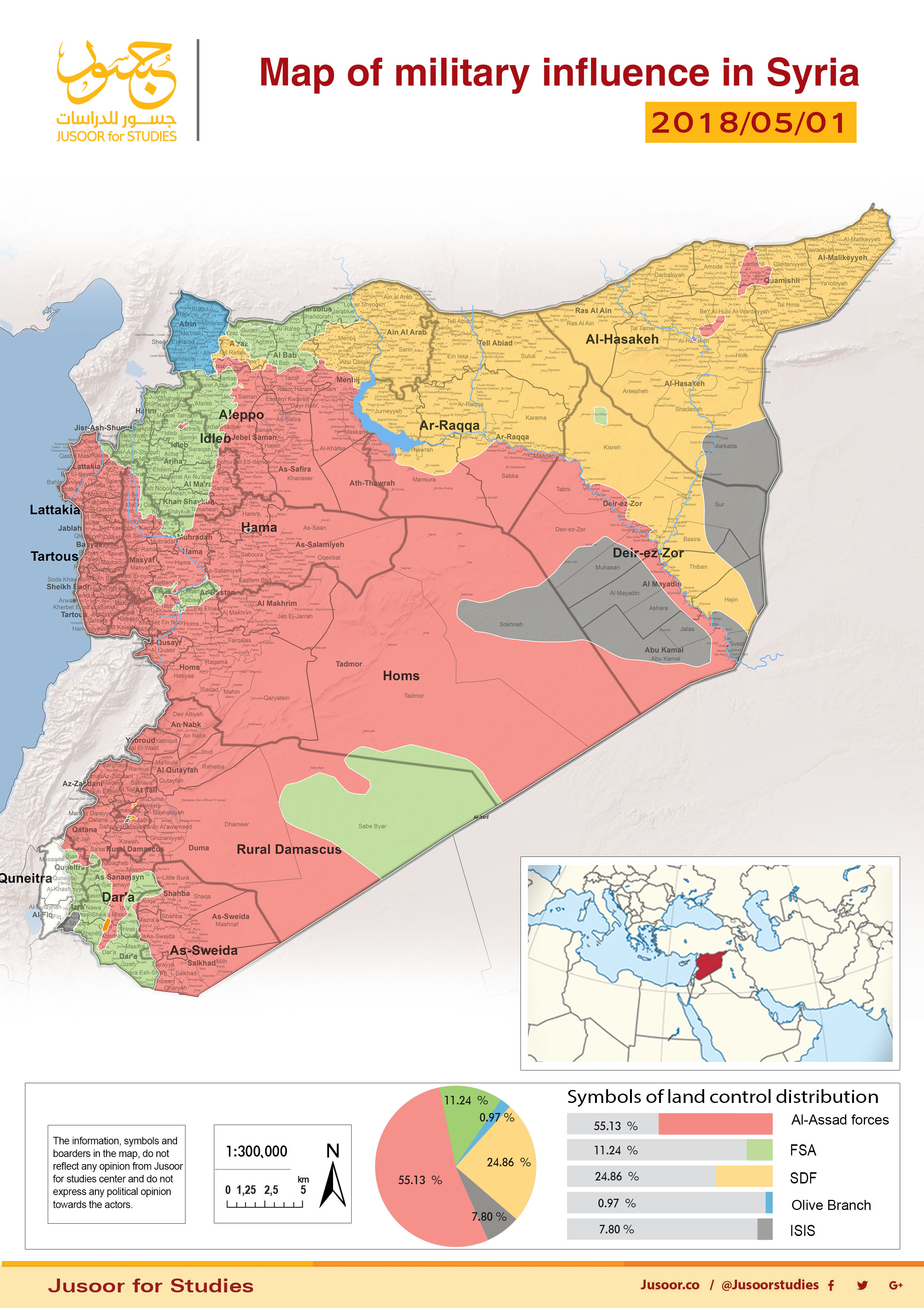According to the monthly map issued by the Jusoor Center for Studies, the ration of Syrian regime control amounted to 55.13%, an increase from 54.63% in the previous month. The SDF control decreased very little from 24.86% compared to 24.93% in March due to the completion of the Olive Branch Battle operations in the vicinity of Afrin.