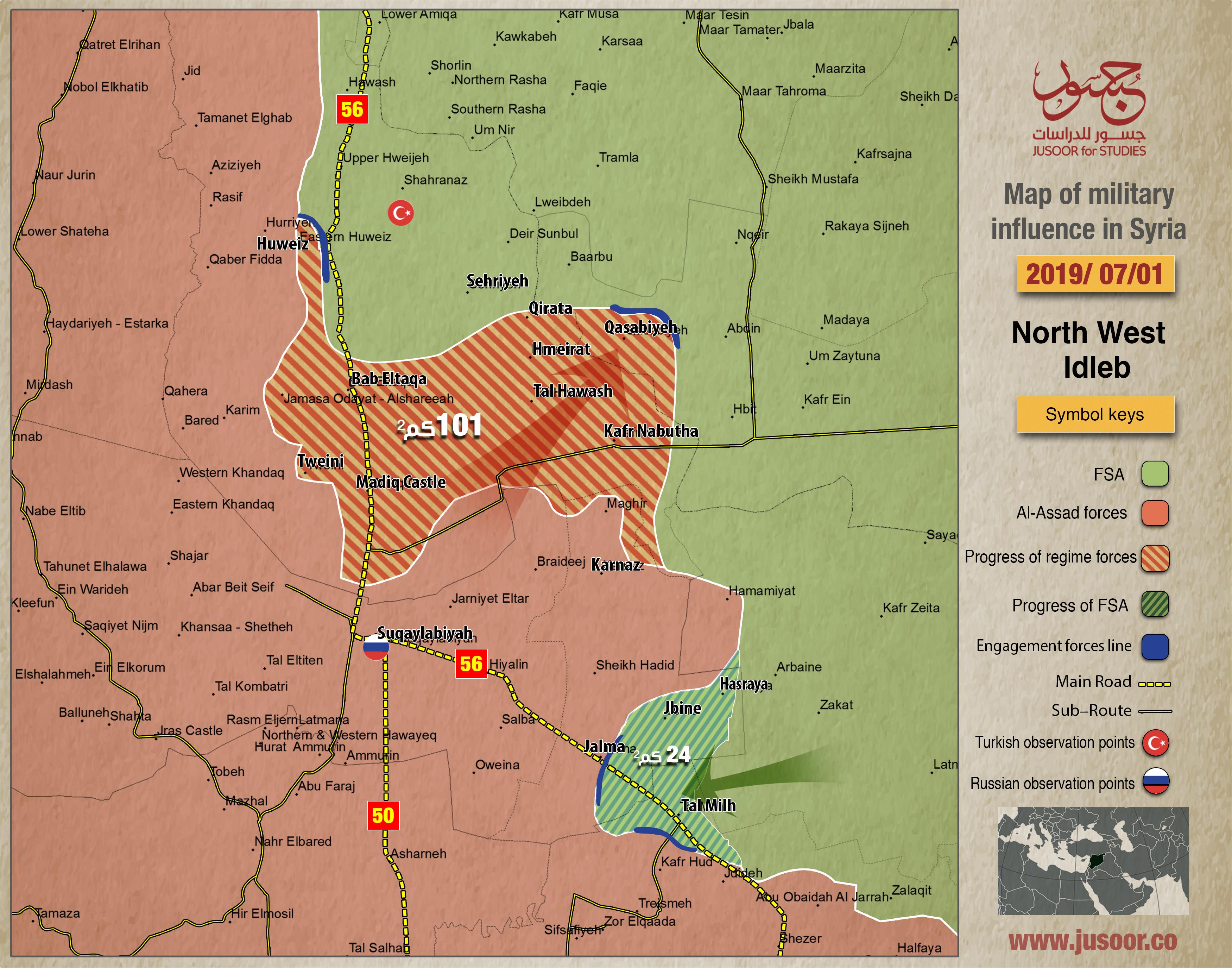 The Syrian opposition factions managed to change the form of military control in the rural areas of north western Hama, south of the town of Kafr Nabudah, after launching a ground counter offensive on 6 June 2019. Through the counter-offensive, opposition factions managed to gain control of the strategic Tel Meleh hill and the villages of Hasraya and Jibeen. The factions were also able to enter the village of Kafrhood and parts of the village Jalmeh before withdrawing from them following heavy aerial bombardment.