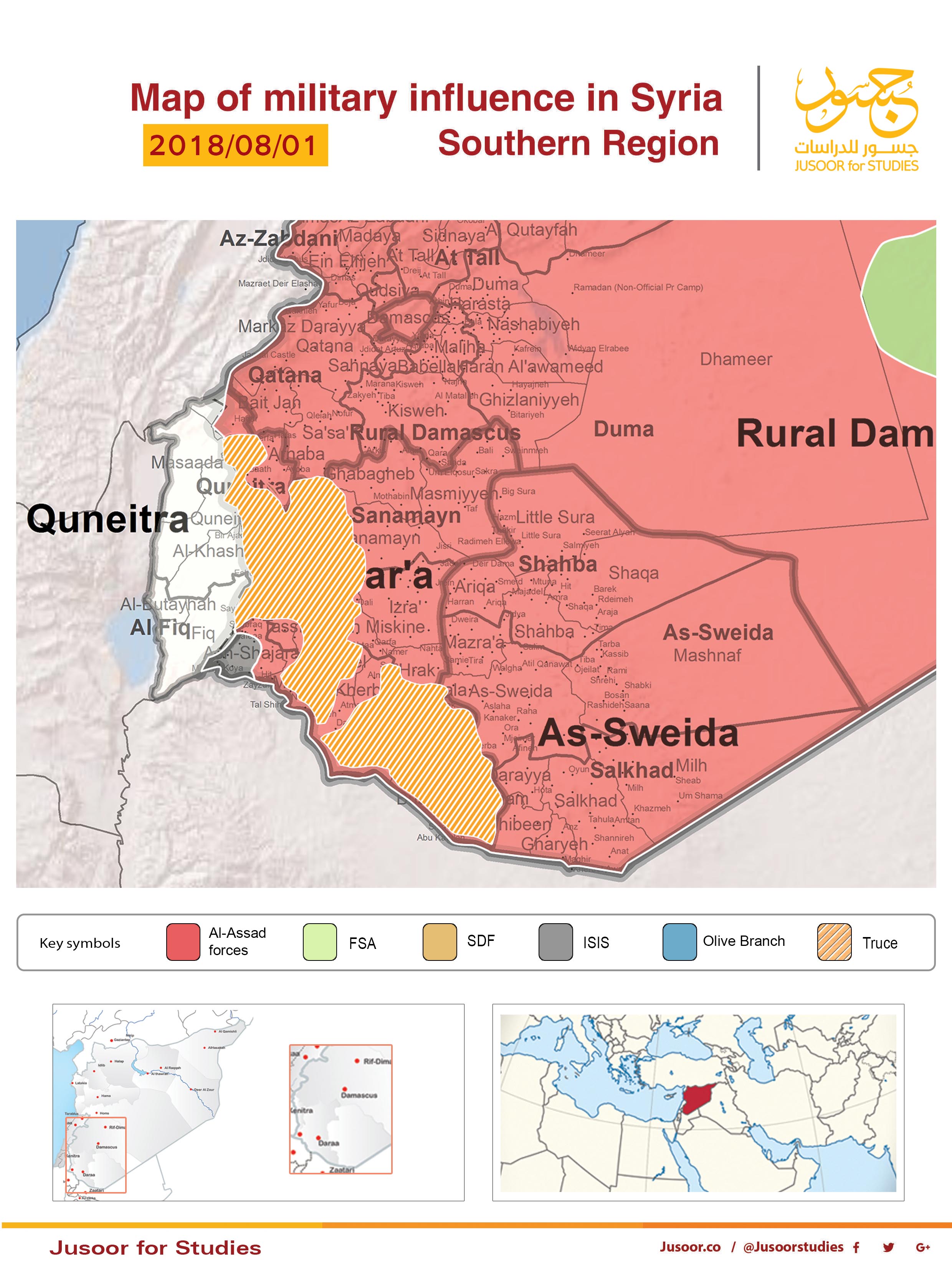 The Syrian regime gained control of Daraa and Quneitra provinces in the south of the country in July, whereas some villages in the Yarmouk Basin remained under the control of ISIS.