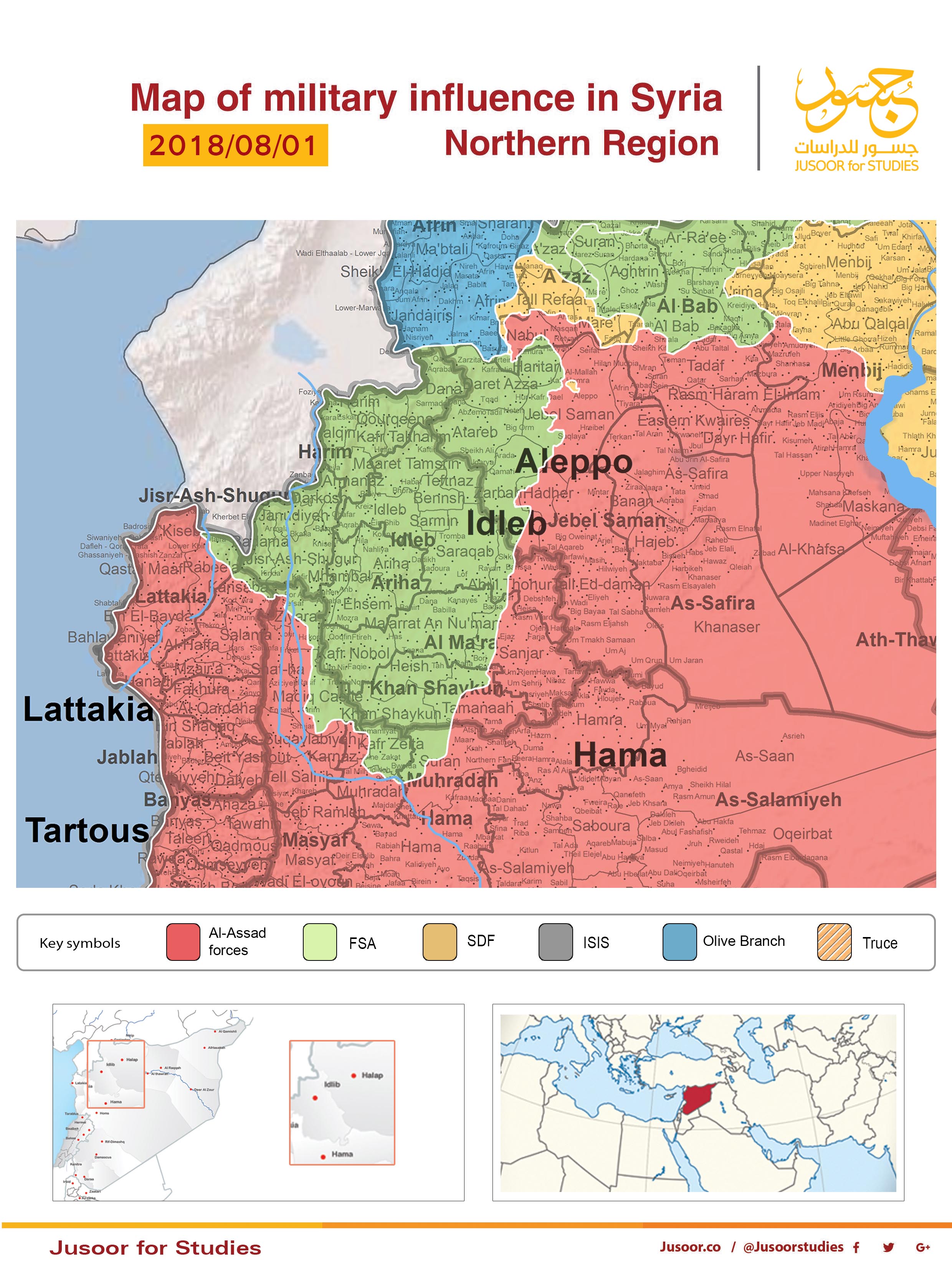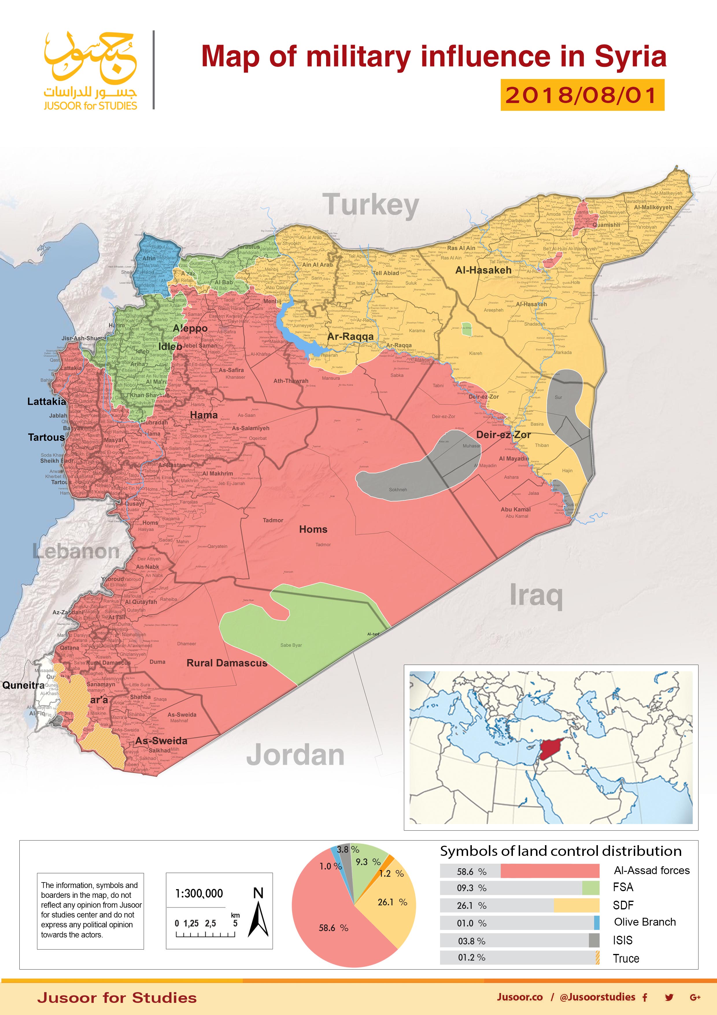 The map of military influence in Syria for July 2018 showed a significant change in the total ratios of control among most of the forces compared to the ratios recorded in the previous month. July witnessed major events, the most important of which was the Syrian regime taking control of the entire southern provinces of Daraa and Quneitra, with the exception of some ISIS-controlled villages.