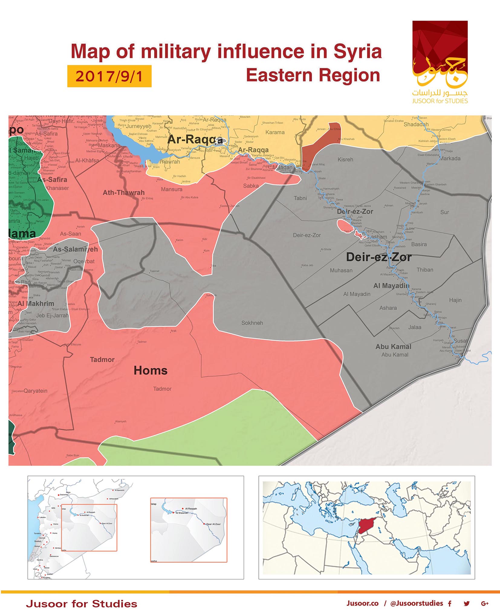 As for the SDF backed by the international coalition, there has been slow progress in Ar-Raqqa neighborhoods, at which 50% of the city's neighborhoods have come under its control in August 2017 according to a statement from the international coalition's American envoy. However, this percentage did not change the percentage of the SDF total influence. A shrinkage in the areas controlled by ISIS is obvious after losing one of its most significant posts in Al Badia represented by Al Sukhna city along with the siege imposed upon its combatants in two military pockets. The first one in Uqayribat and the other one north of Al Sukhna. On the other hand, there were failed attempts from the regimes forces to make progress in Deir ez-Zor fronts, as the city is under siege by ISIS.