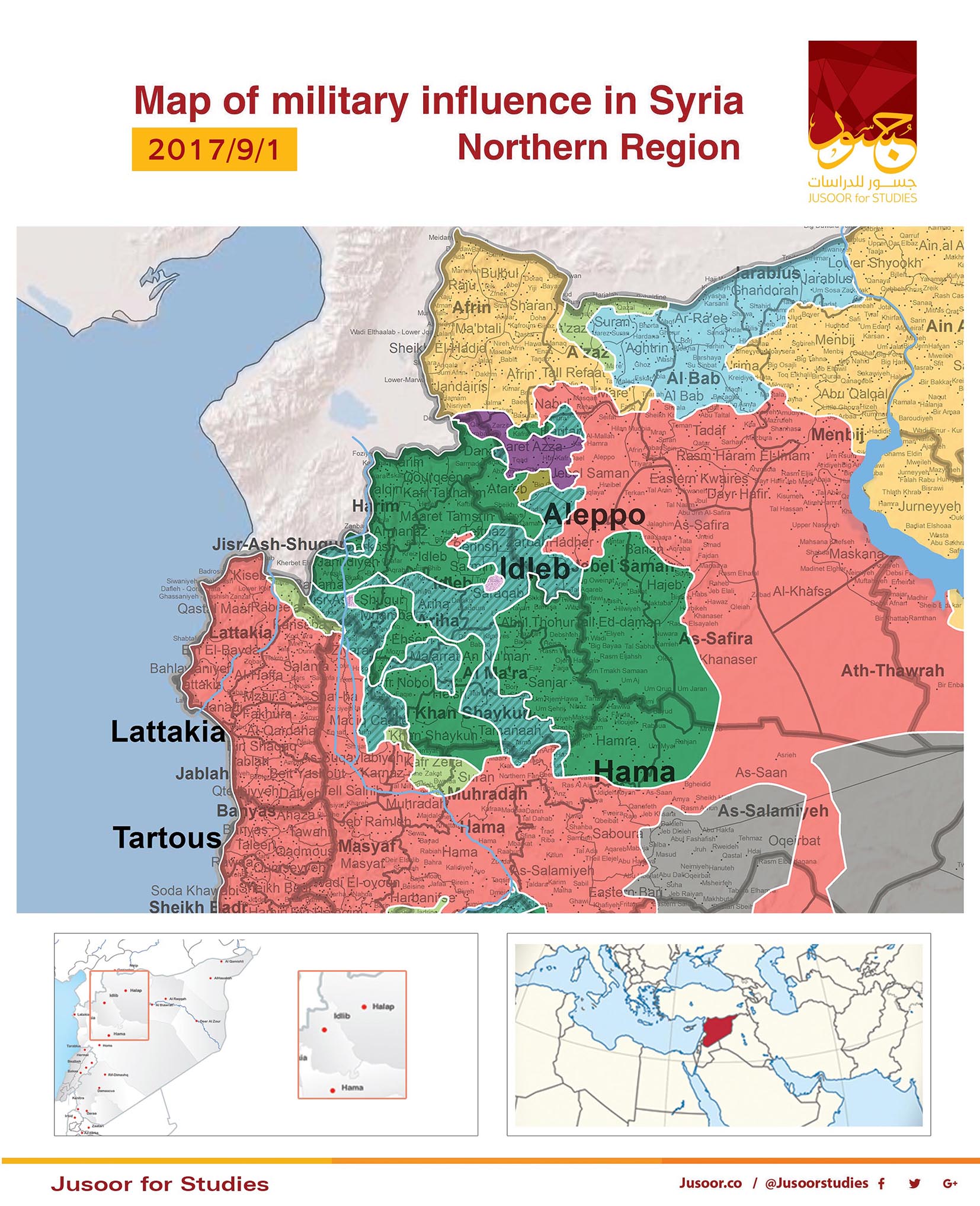 Jusoor for Studies issued the map of influence of August 2017, that shows stable percentages of the total control between the different conflicting parties excluding regions controlled by ISIS in the East Hama Governorate and south Ar-Raqqa city.
