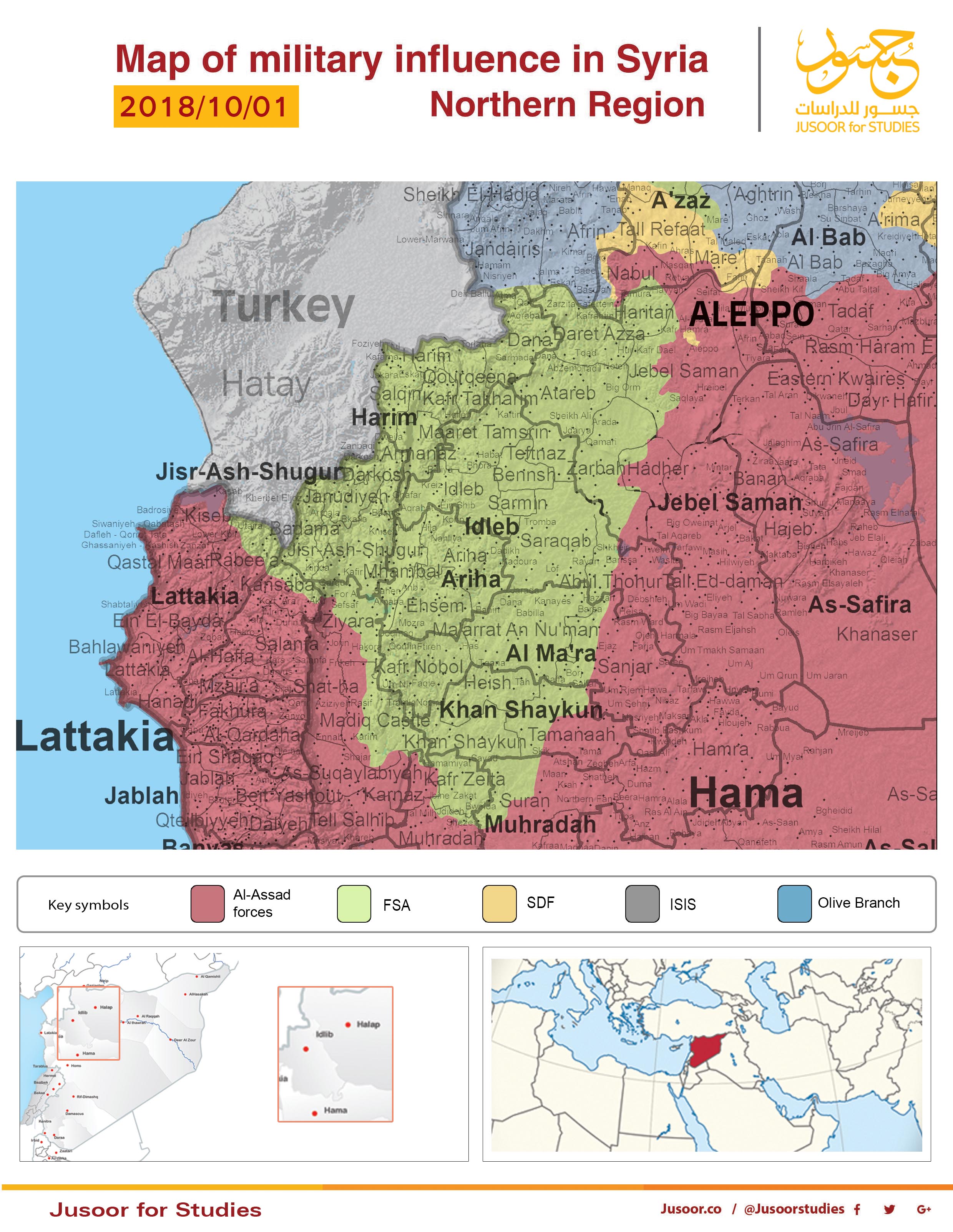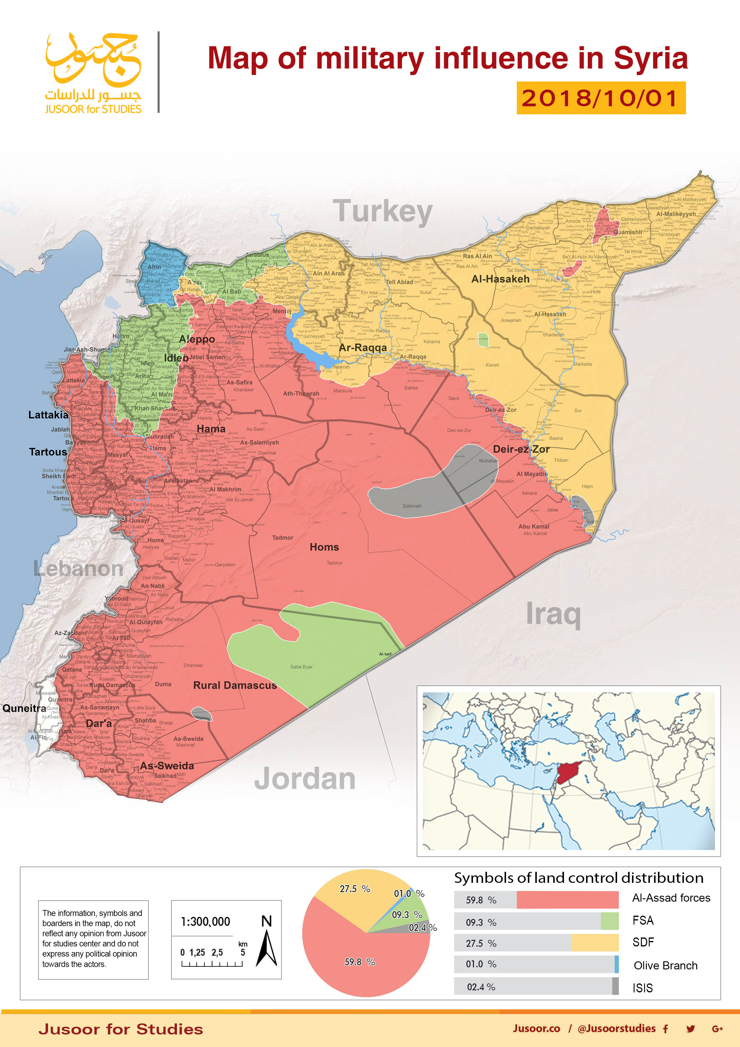 The map of military influence in Syria for September 2018 showed stability in the total ratios of control among most of the forces. Areas and fronts did not witness significant military movements with the exception of battles between ISIS and SDF and between ISIS and the Syrian regime in eastern Syria. The relative stability of the ratios of control has been reinforced by the agreement reached by Turkish President Recep Tayyip Erdoğan and Russian President Vladimir Putin after the Sochi Summit on September 17 as the agreement suspended an anticipated military operation in northern Syria.
