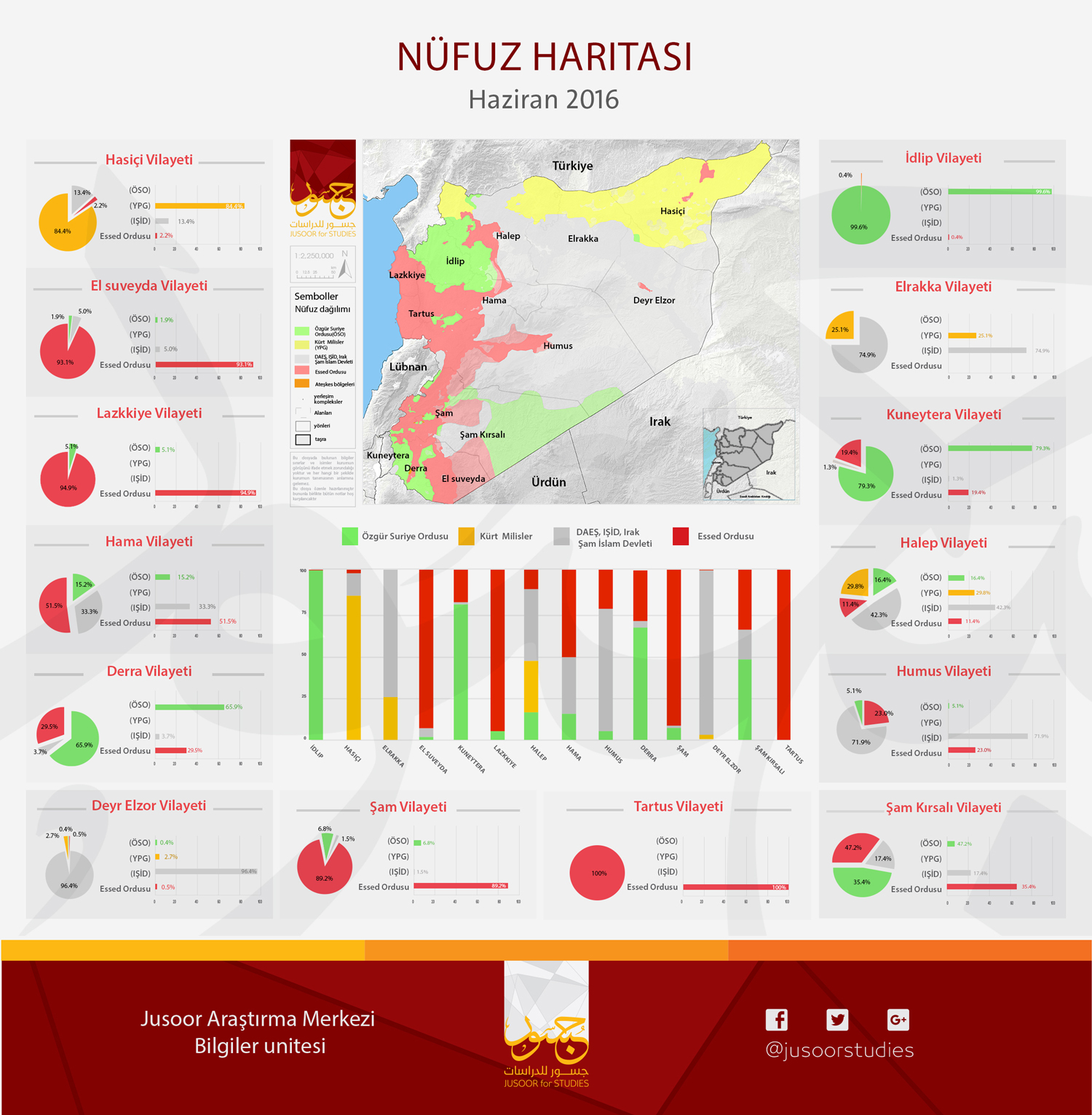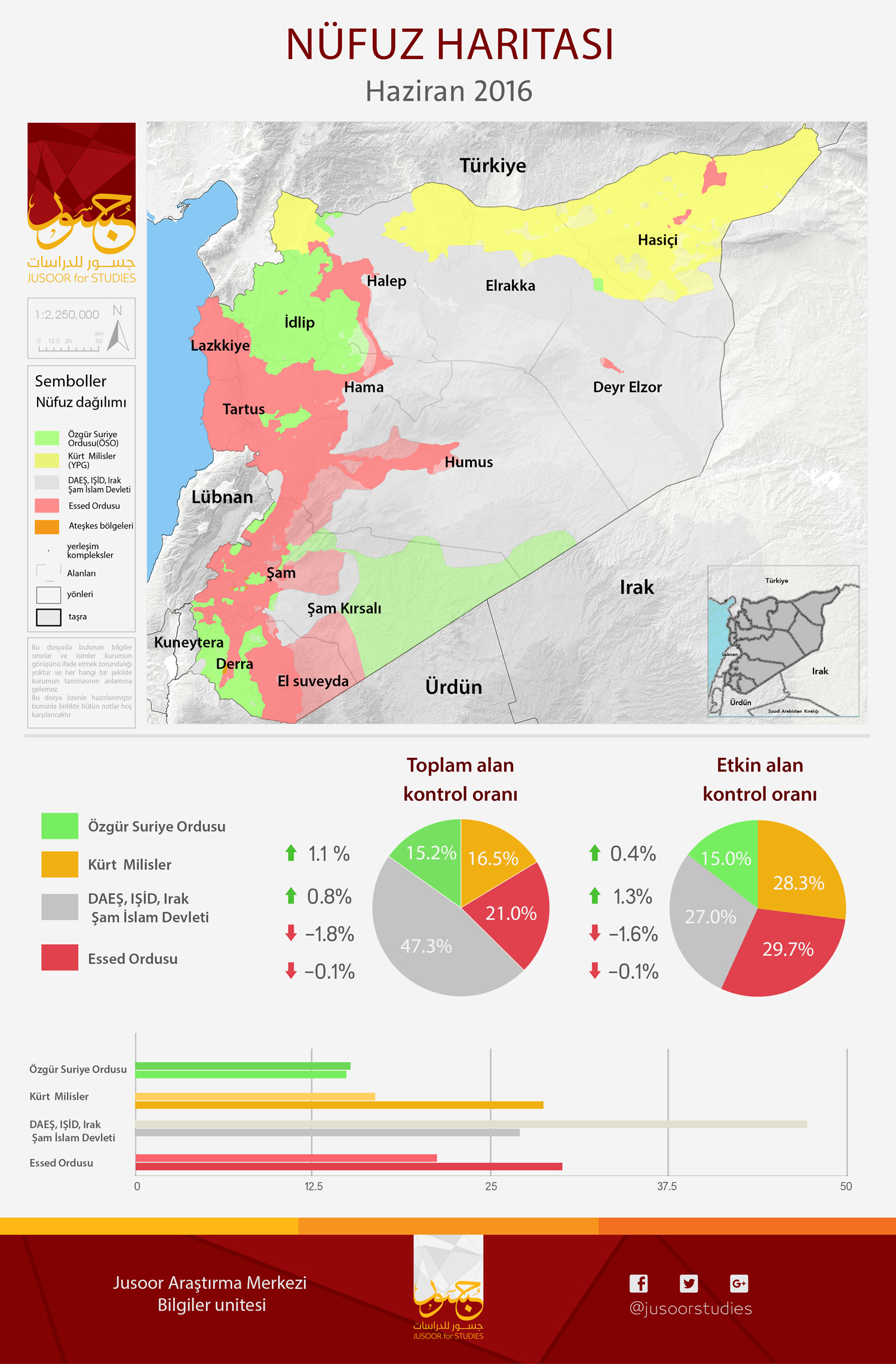 Jusoor Araştırma Merkezi 2016 Haziran ayı askeri nüfuz haritasını yayınladı, harita savaşan tarafların arasındaki toplam ve etkin kontroldeki 2016 Mayıs haritasına nazaran değişimleri göstermiş oldu.
