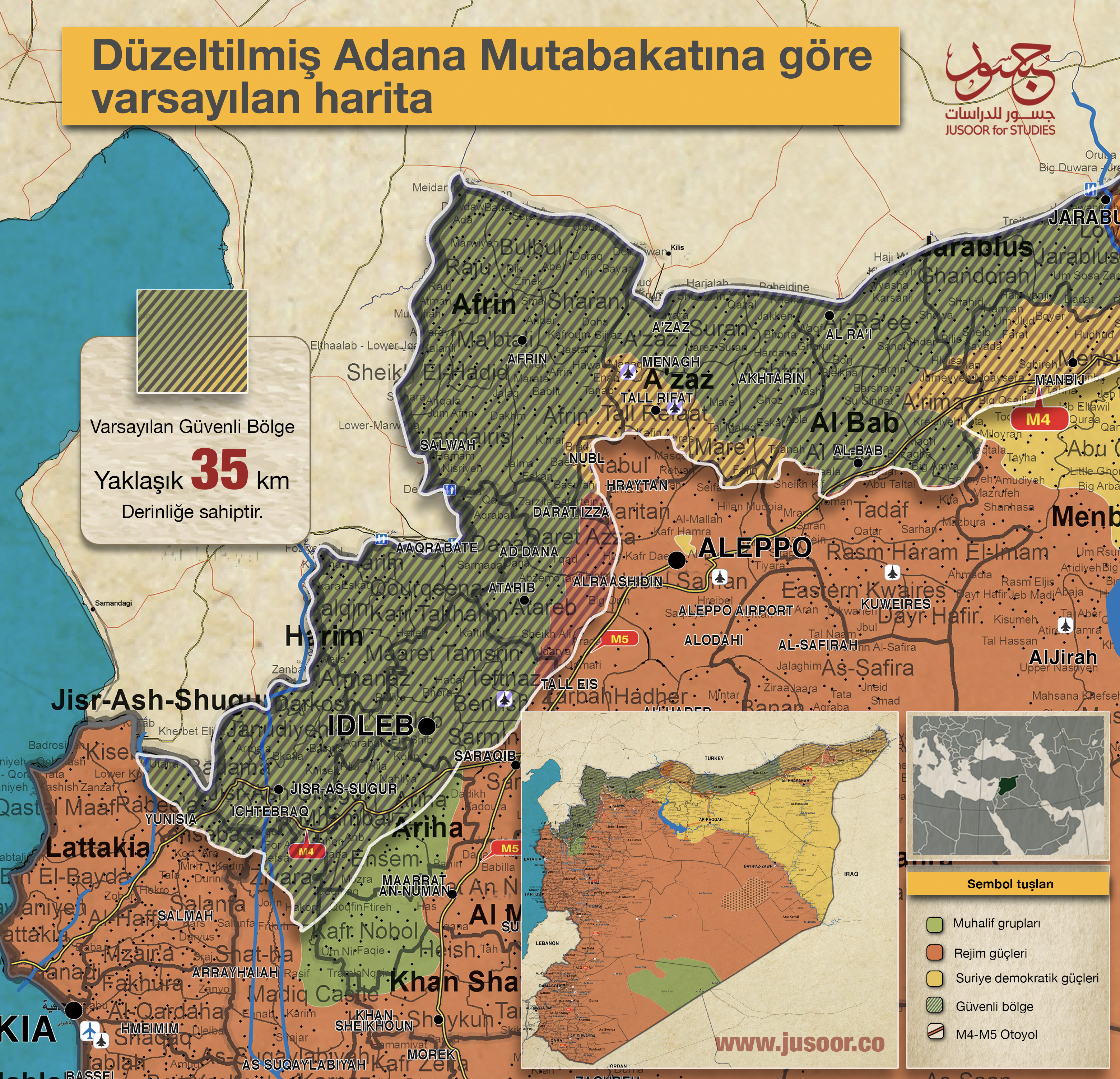 Jusoor Araştırma Merkezi, 21 Şubat 2020'de Cumhurbaşkanı Recep Tayyip Erdoğan'ın açıkladığı ve kuzey ve doğu Suriye'deki sınır şeridi boyunca kurulması öngörülen güvenli bölgenin haritasını çıkardı. Haritada öngörülen güvenli bölgenin derinliği, 35 km'dir. Bununla birlikte bu derinlik, Suriye'nin kuzeybatısında İdlib ve çevresinde rejimin ilerlediği temas hatlarının değiştirilememesi veya bunun istenilmemesi durumunda, bazı bölgelerde artabilecek veya azalabilecektir. Öngörülen güvenli bölge, çoğunlukla 1998 yılında imzalanan Adana Mutabakatının maddelerinde yapılan değişiklik kapsamında olacak ve Rusya ile Türkiye arasındaki ikili görüşmelerde onaylanacaktır.