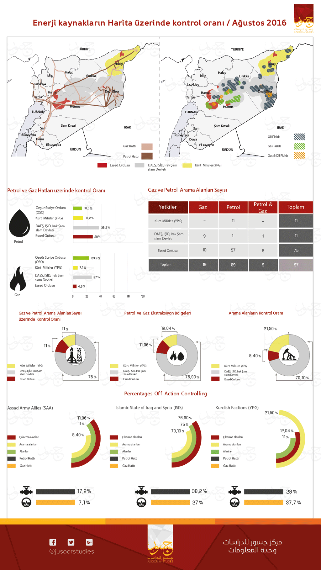 Suriye'de farklı alanlar üzerinde oluşan askeri çatışmalarının etkisini araştırma ve aydınlatma merkezi Cisürün gösterdiği çaba çerçevesinde Savaşın devamlılığı için savaşan taraflara gereken likidite ve savaş araçlarına yakıt ikmali ve savaşçıların malzemelerini temin etme açısından enerji kaynaklarının öneminden yola çıkarak, Merkez savaşan gurupların kontrol alanları, petrol ve gaz kuyuları, petrol çıkartma oranı, taşıma yolları ve her tarafın  oranını, araştırdı ve ona göre Suriye'de enerjinin geldiği durumu belirtmek üzere bir harita hazırladı