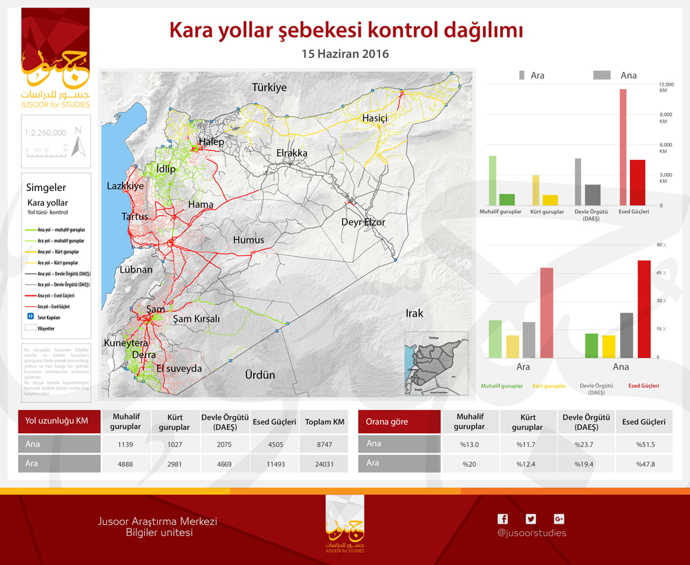 Jusoor Araştırma Merkezi Suriye’deki farklı tarafların Kara yollar şebekesinin kontrolünü sergileyen harita yayınlamıştır, özelikle Ana ve birinci dereceden ara yolları kapsamakta.