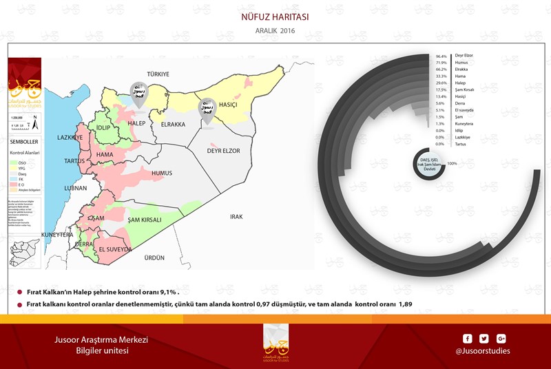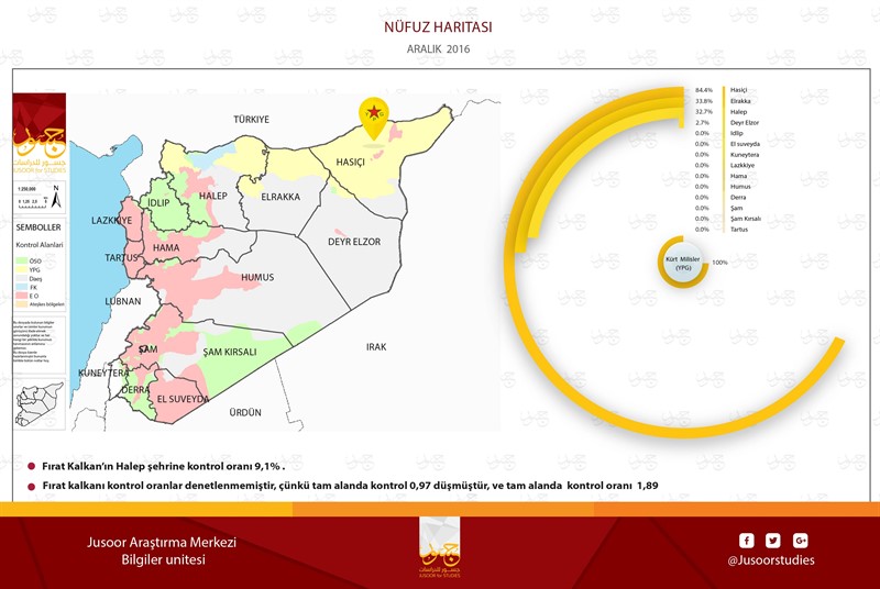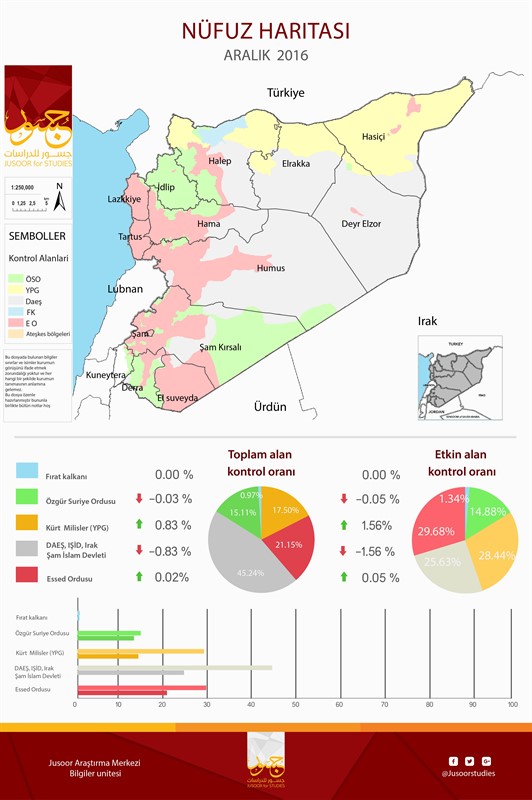 Jusoor Araştırma Merkezi  2016/ Aralık ayının askeri nüfuz haritasını yayınladı, haritada Kasım 2016 ayının sahada savaşan tarafların tam ve etkin hakimiyet oranların değişiklikleri gösterdi.