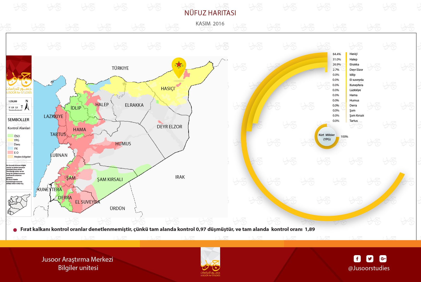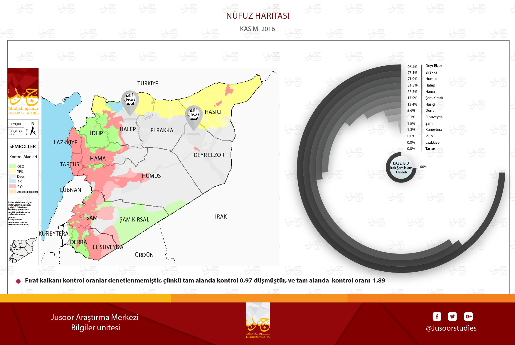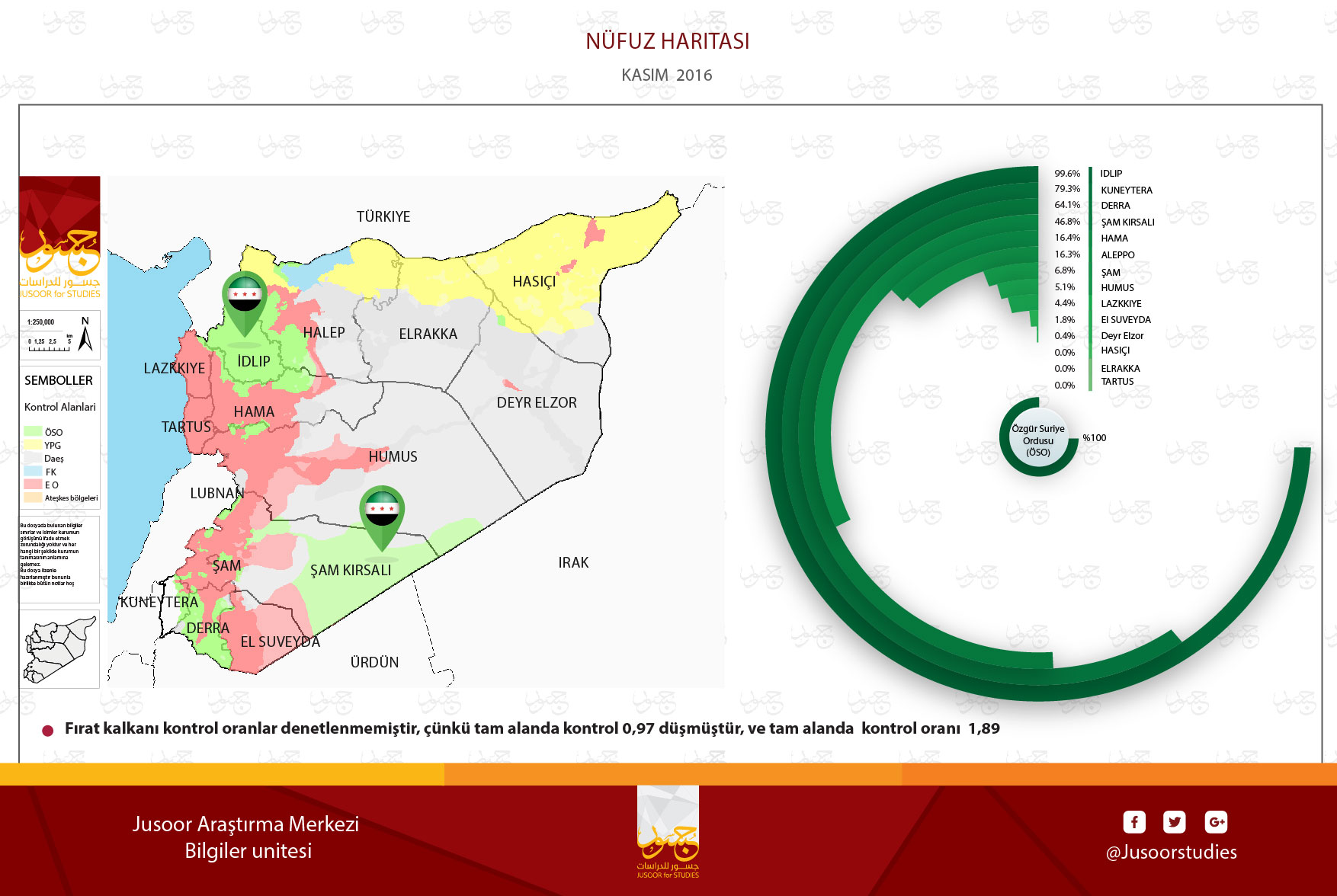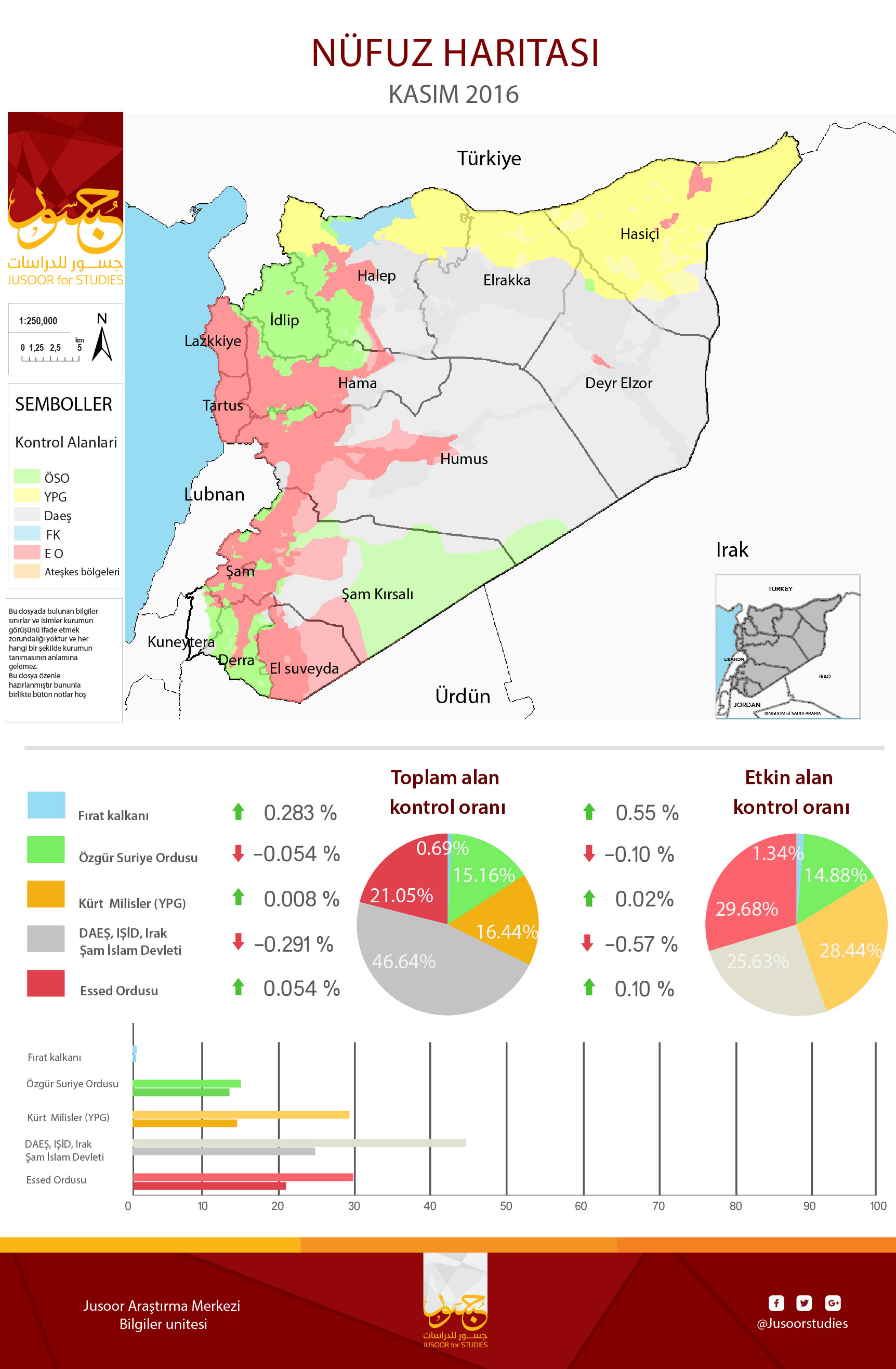 Jusoor araştırma merkezi 2016 Kasım ayının askeri nüfuz haritasını yayınlamıştır., haritada savaşın bir çok taraftan Ekim 2016 haritasına göre kontrol açısından bazı değişiklikler görülüyordu.