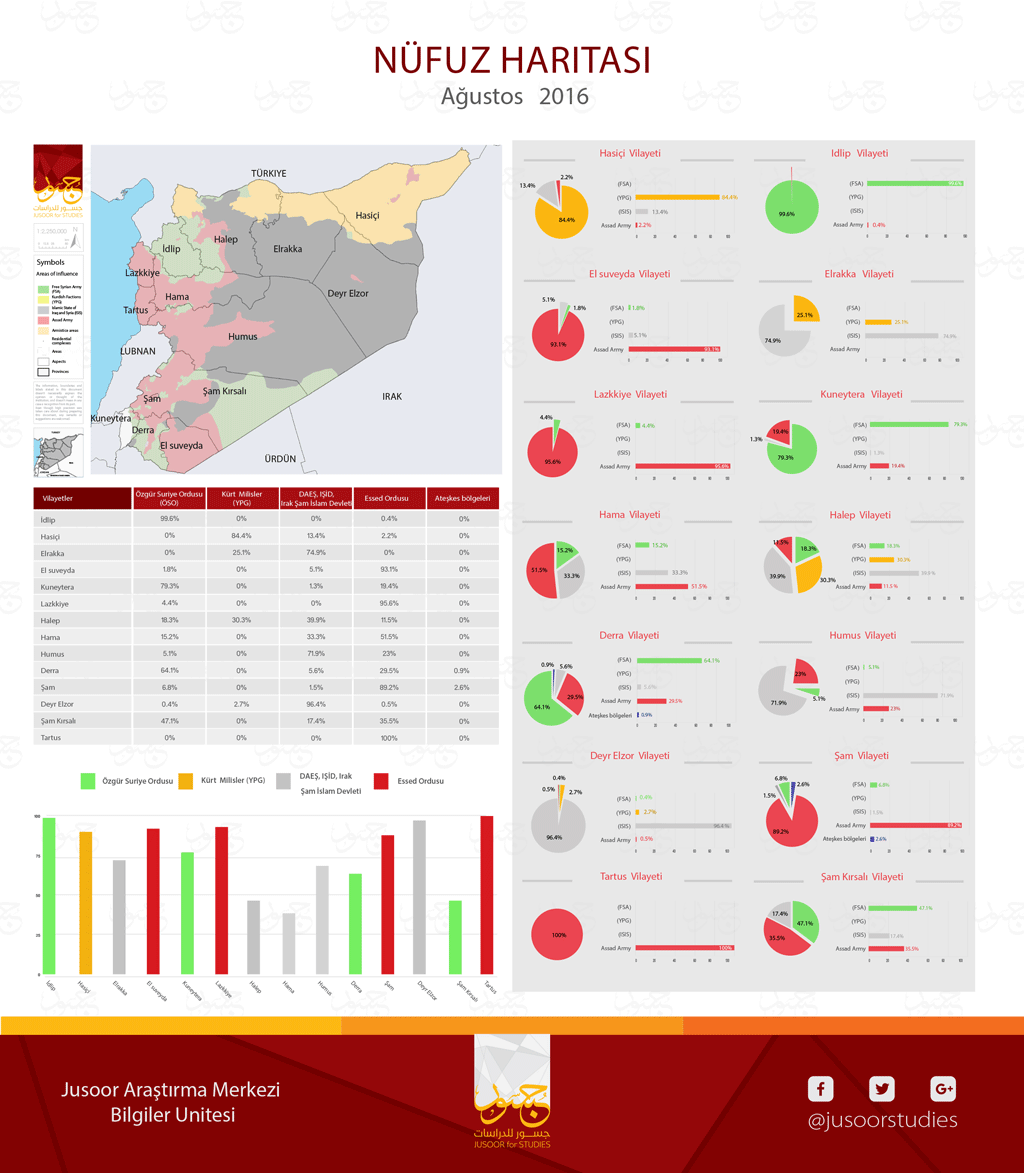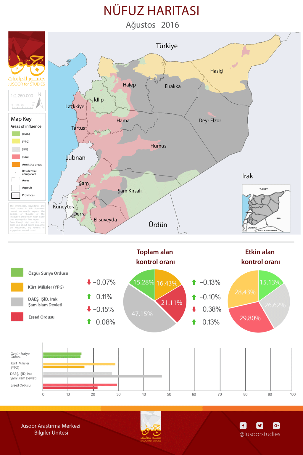 2016 Ağustos ayında Jusoor Araştırma Merkezi bir harita çıkardı, temmuz 2016 haritasından bazı değişen durumları bilertmek amacıla  tamamen ve çeşitle atrafların savaşmayı.