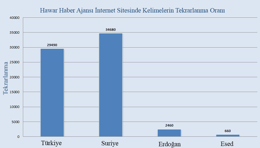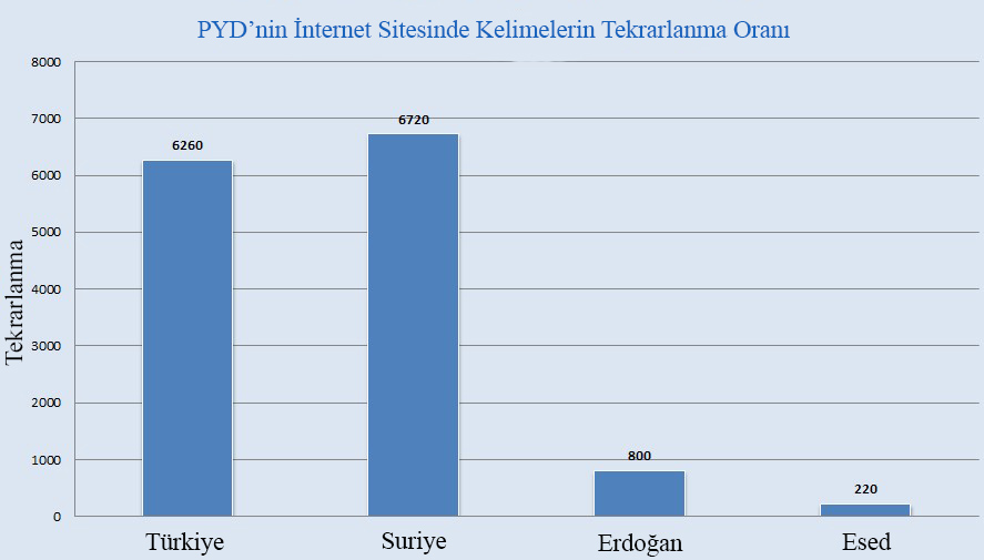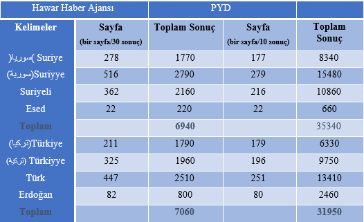 Örgüt ve uzantıları “Erdoğan diktatörlüğü” adını verdikleri meseleye odaklanıyor. Ancak aynı şekilde “Esed diktatörlüğü” terimini kullanmıyorlar. 14/1/2018 tarihinde örgütün ve Hawar Haber Ajansının (örgütün sivil ve askeri faaliyetlerini aktaran resmi ajansıdır) internet sitelerinde (Suriye- Suriyeli, Esed) ve (Türkiye- Türk, Erdoğan) kelimeleri üzerine yapılan aramayla çıkan sonuçlar Tablo 1’deki gibidir.