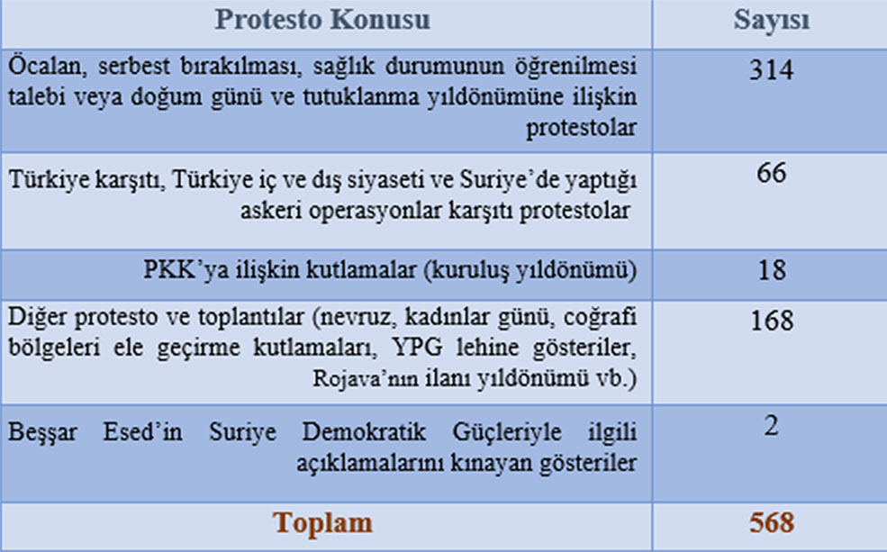 Jusoor Araştırma Merkezinin, 1/1/2017 tarihinden 31/12/2017’ye kadar PYD ve uzantısı kuruluşların gerçekleştirdiği protestolar ve kitlesel toplantılar üzerine yaptığı bir gözlemde (568) protesto ve kitlesel toplantı düzenlendiği ortaya konulmuştur. Bunların %70’i PKK, Abdullah Öcalan ve Türkiye meseleleriyle bağlantılıdır. (bkz. Tablo 2) Ayrıca bu gözlemde 2017 yılı sonlarında Esed’in, Suriye Demokratik Güçlerini ihanetle itham ettiği açıklamalarına ilişkin iki gösteri dışında Esed’e veya işlediği suçlara karşı hiçbir faaliyette bulunulmadığı da gözlemlenmiştir!