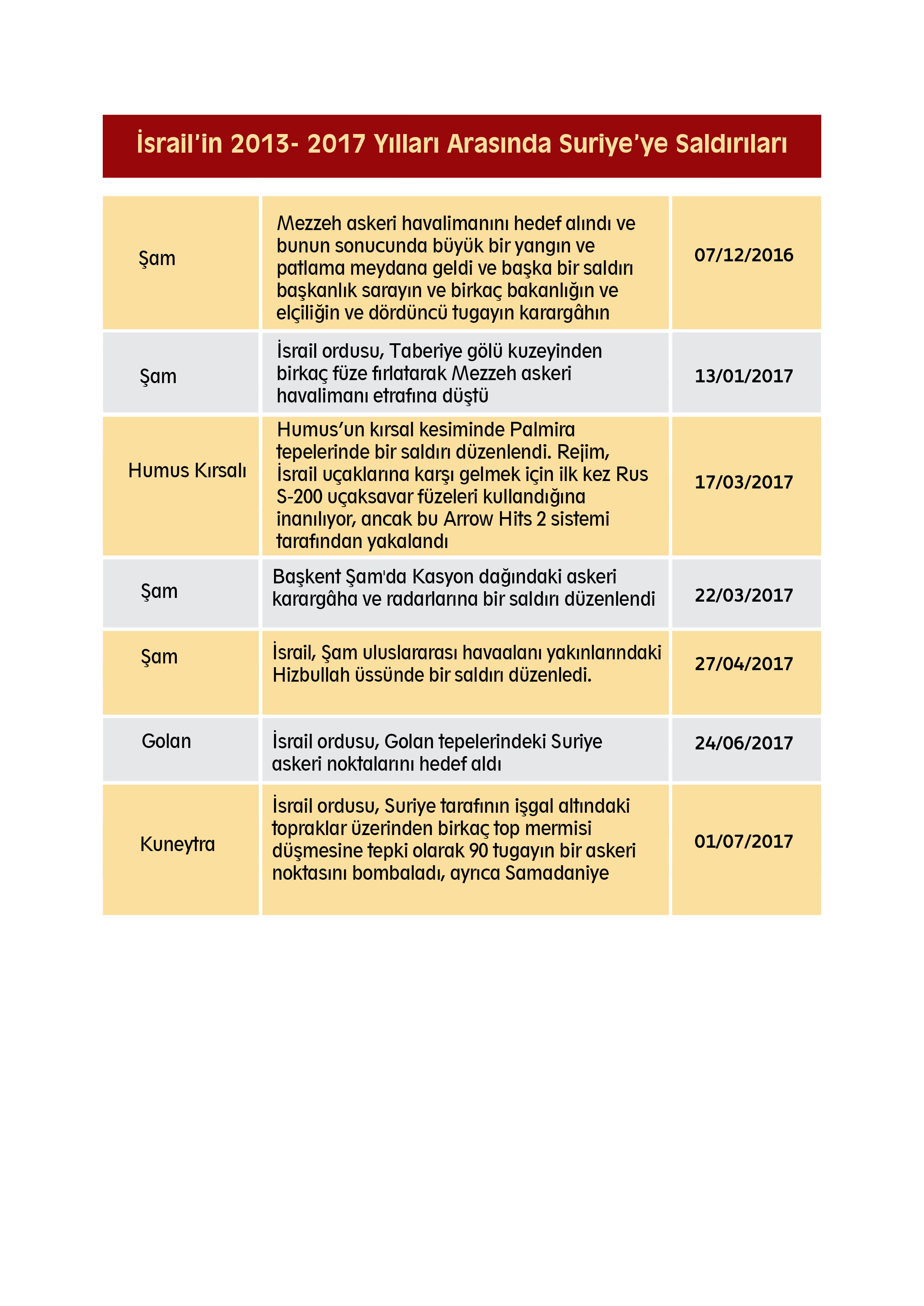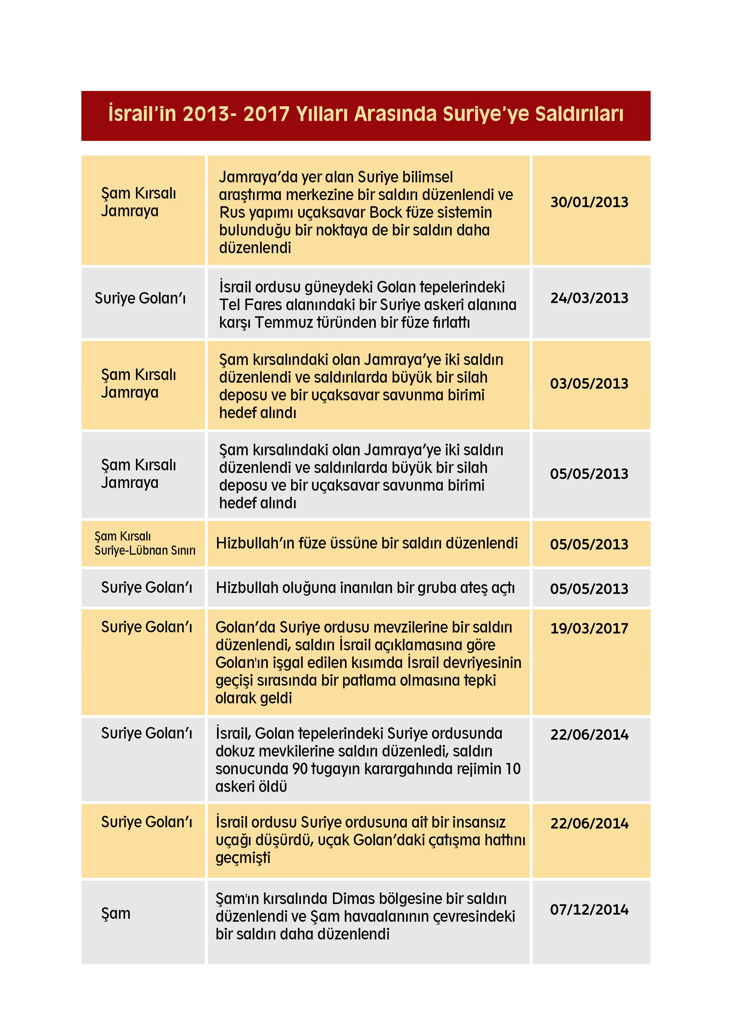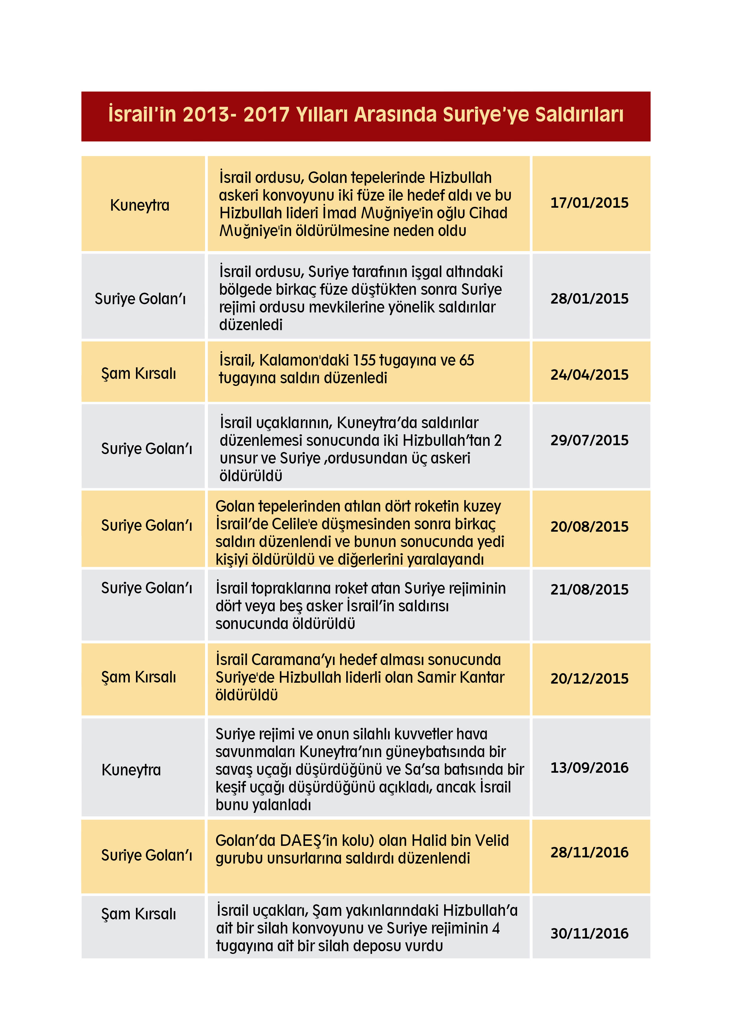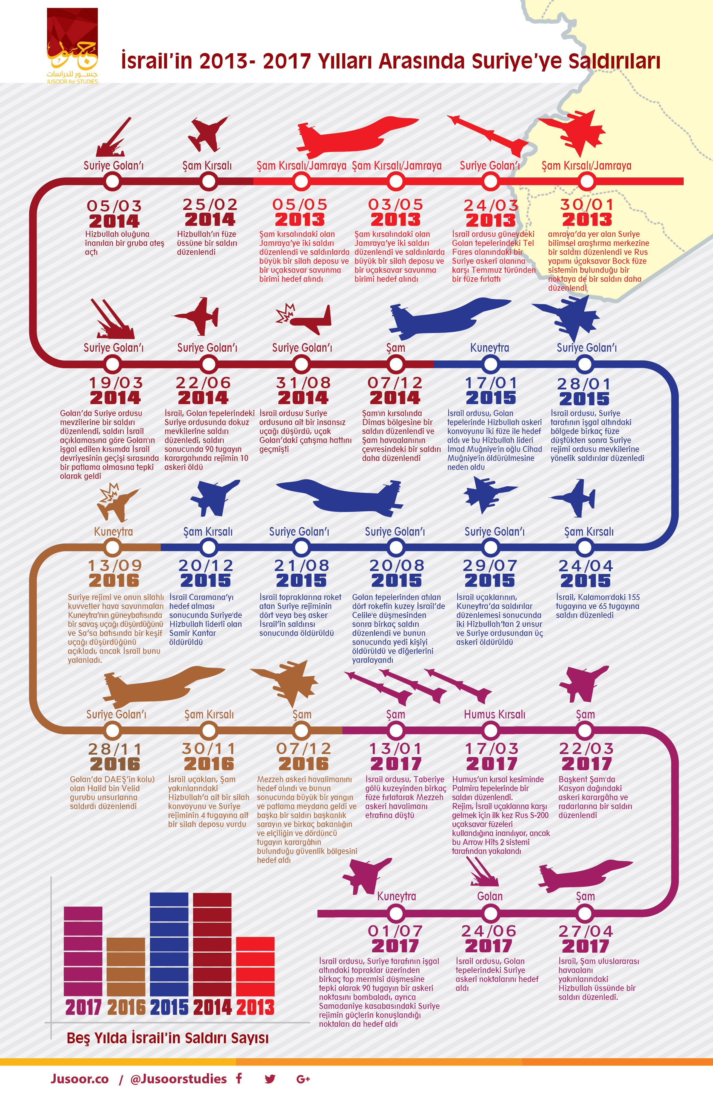 Dolayısıyla 19 /7/2017 tarihinde İsrail başbakanı açıklama yapmış ve Suriye’ye onlarca saldırı yapıldığını ilan etmiştir(1). Ve aşağıda geçen tablo (1)de geçen 5 yılda İsrail saldırılarının sayısını göstermiştir.  Ayrıca bu tabloda saldırıların %36'sı Golan bölgesinde gerçekleşmiştir galiba taktik amaçlı angajman kuralları çerçevesinde Suriye Golan sınırları içerisinde yaşanmıştır.