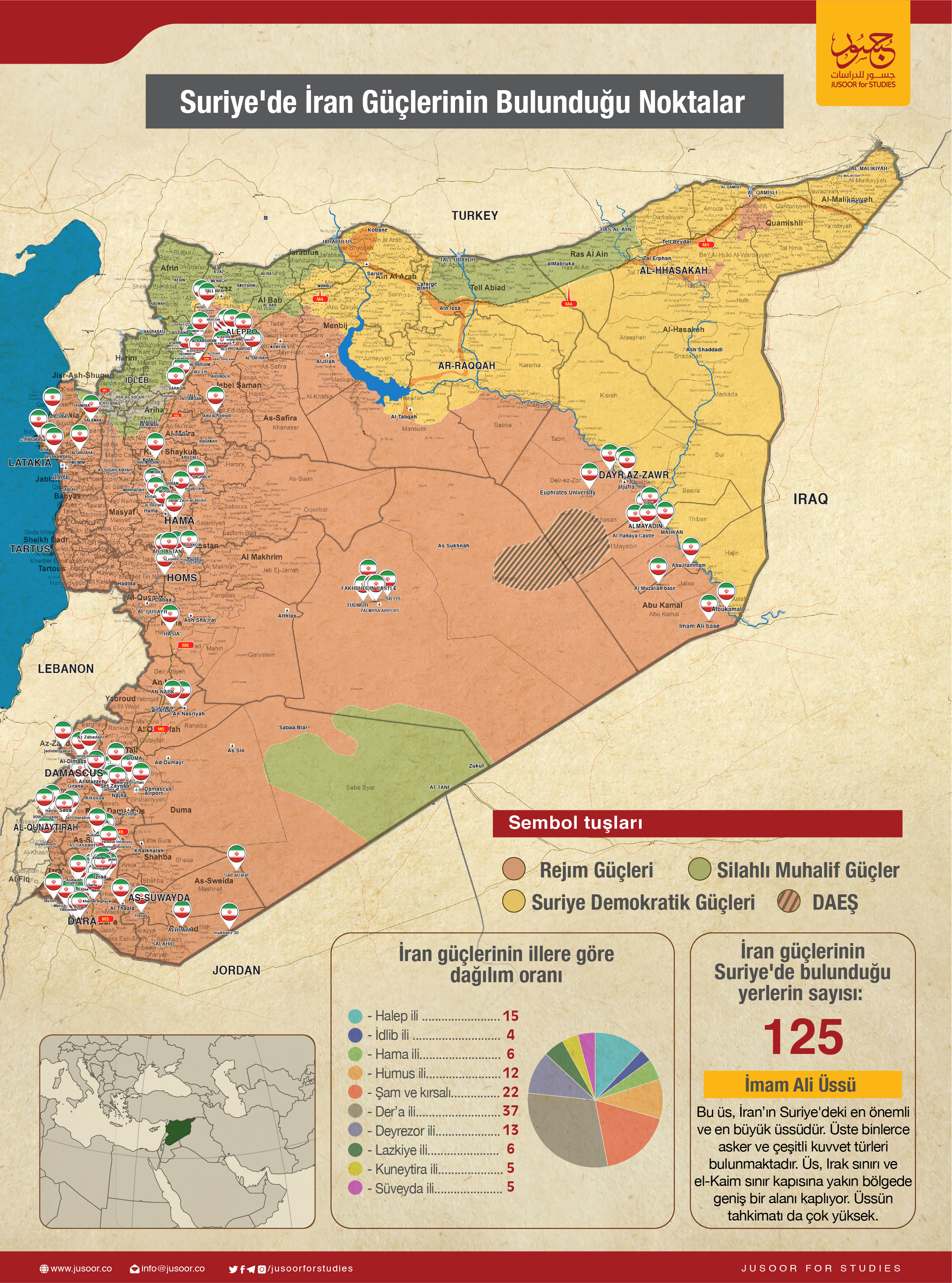 Jusoor Araştırma Merkezi, 1 Ağustos 2020'de Suriye'de İran’a bağlı milislerin değil, sadece İran güçleri ve üslerinin bir haritasını yayınladı. Buna göre İran, Der’a’da 37 mevki, Şam ve kırsalında 22 mevki, Halep’te 15 mevkiye sahip. Haritaya göre İran, 10 ilde toplamda 125 mevkiye sahip.