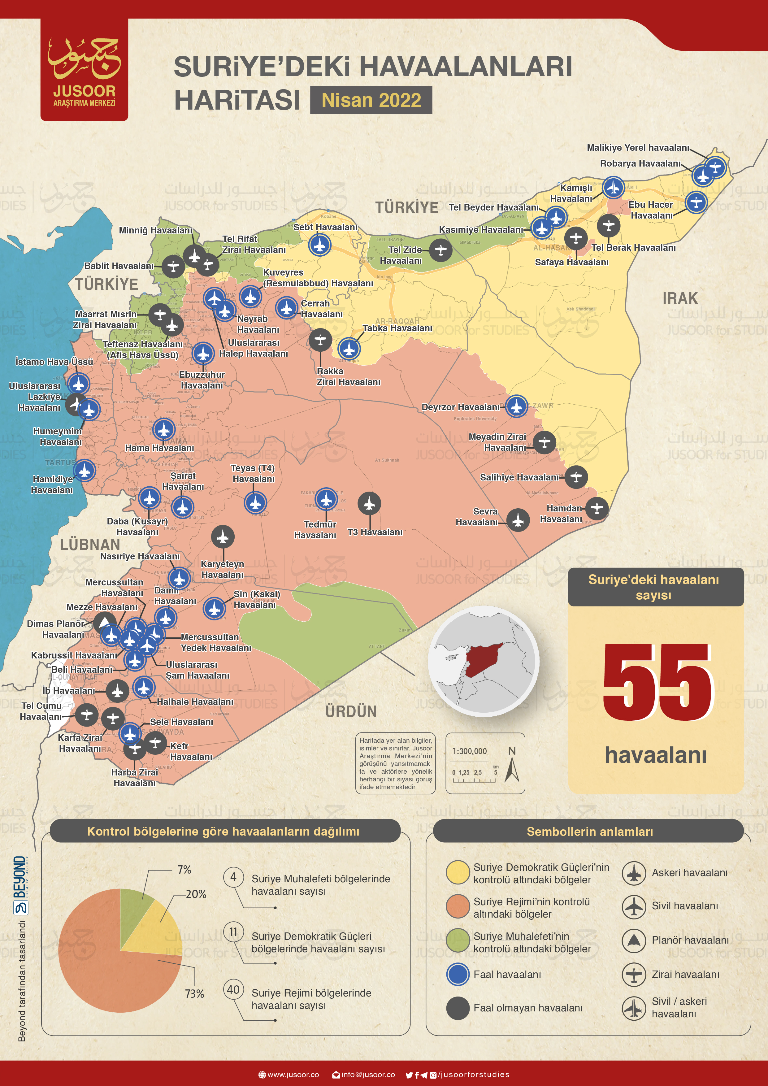Jusoor Araştırma Merkezi, Suriye'deki askeri, sivil, zirai ve planör uçakların inip kalktığı 55 adet havaalanını gösteren bir harita yayınlıyor. Bunlardan 33’ü faal durumda. 22 tanesi ise faal değil ve çoğu askeri üsse dönüştürülmüş durumda. Bazı zirai havaalanları gibi tamamen terk edilen ve içlerinde hiçbir güç bulunmayan bazı havaalanları da mevcut.